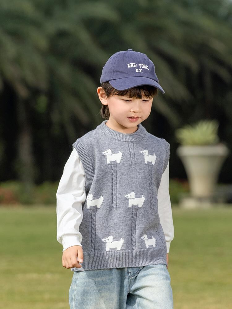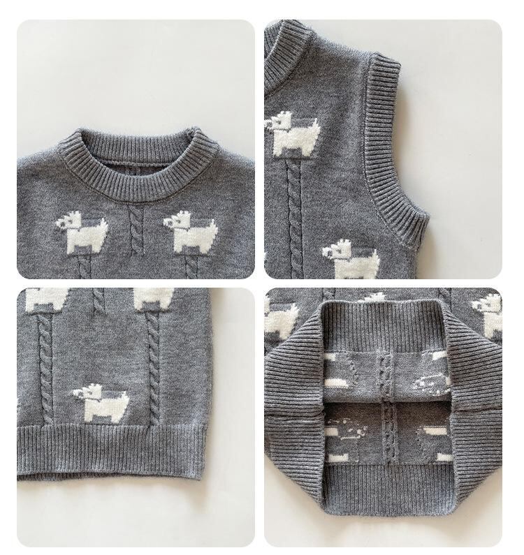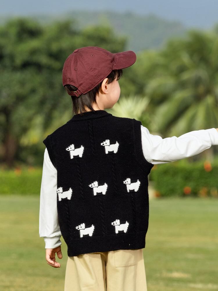 子供服 ベスト 春秋 男女兼用 ニット チョッキ かわいい 小犬柄 柔らかい ポリエステル 通園 通学 普段着 グレー ブラック系 90cm 100cm 110cm 120cm 130cm 140cm 150cm