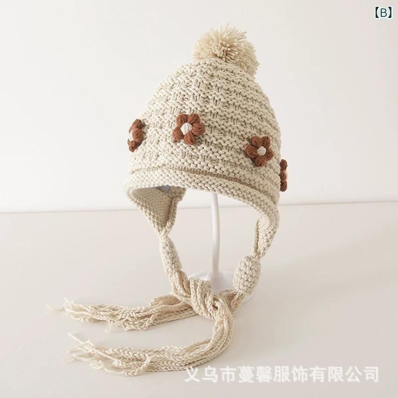 ニット帽 キッズ 秋冬 子供 小花 フリンジ付き 毛糸 帽子 女の子 中童 針編み 防寒 イヤーマフ付き 裏地付き 包頭帽 ベージュ系 レッド系 グレー系