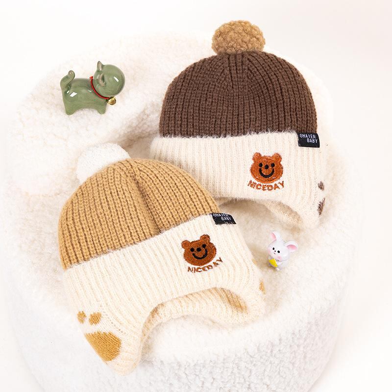 ニット帽 ベビー 用 防寒 帽子 裏ボア 耳当て付き かわいい クマ 子供 赤ちゃん 毛糸 暖かい 秋冬