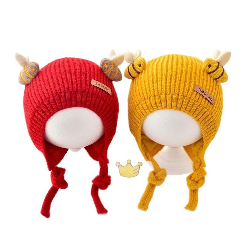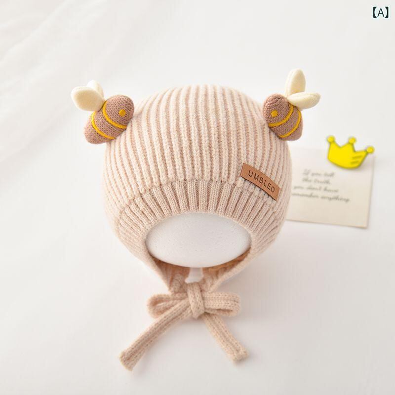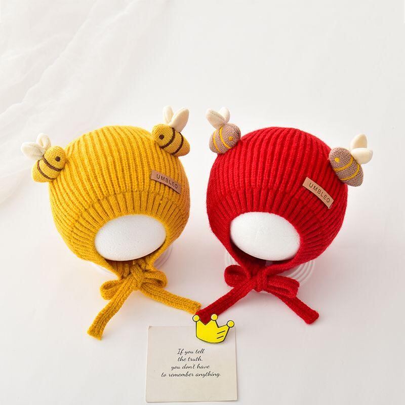 帽子 ベビー 秋冬 ニット帽 赤ちゃん 防寒 防風 かわいい 女の子 耳当て付き あご紐付き 丸型 ミツバチ ベージュ イエロー ブルー ピンク レッド 3ヶ月 6ヶ月 12ヶ月 1歳 2歳