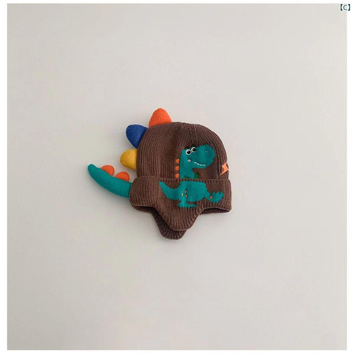ニット帽 キッズ ベビー 秋冬 防寒 立体 恐竜 耳当て付き 保温 防風 6ヶ月〜10歳 ベージュ 水色 紺色 コーヒー色