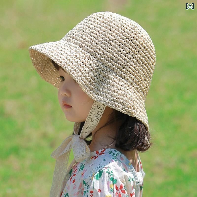 麦わら帽子 キッズ 子供用 帽子 レース あご紐付き 日よけ UVカット 紫外線対策 折りたたみ 持ち運び 携帯便利 ベージュ系 ブラウン系 春夏 海水浴 旅行 リゾート