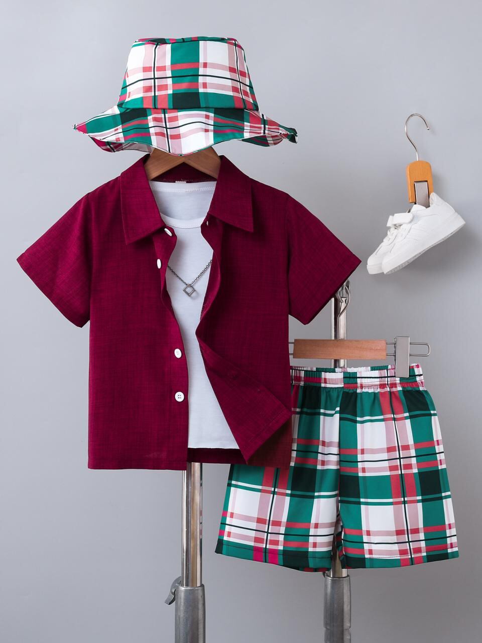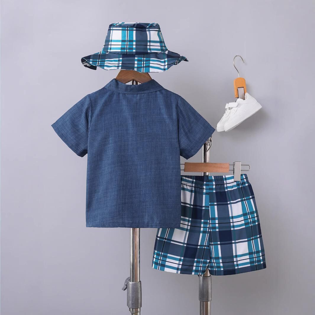 子供服 半袖シャツ 短パン 上下3点セット 男の子 薄手 綿混 格子柄 カジュアル 春夏