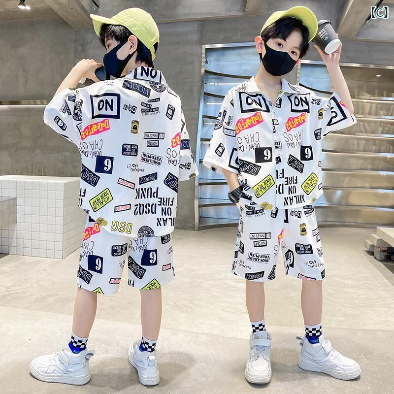 キッズ 男の子 半袖シャツ パンツ 上下セット 子供服 2点セット ボーイズ スポーツ カジュアル ポリエステル 通気性 薄手 普段着 ブラック グリーン ホワイト 大印花 120cm 130cm 140cm 150cm 160cm 170cm