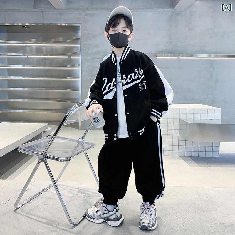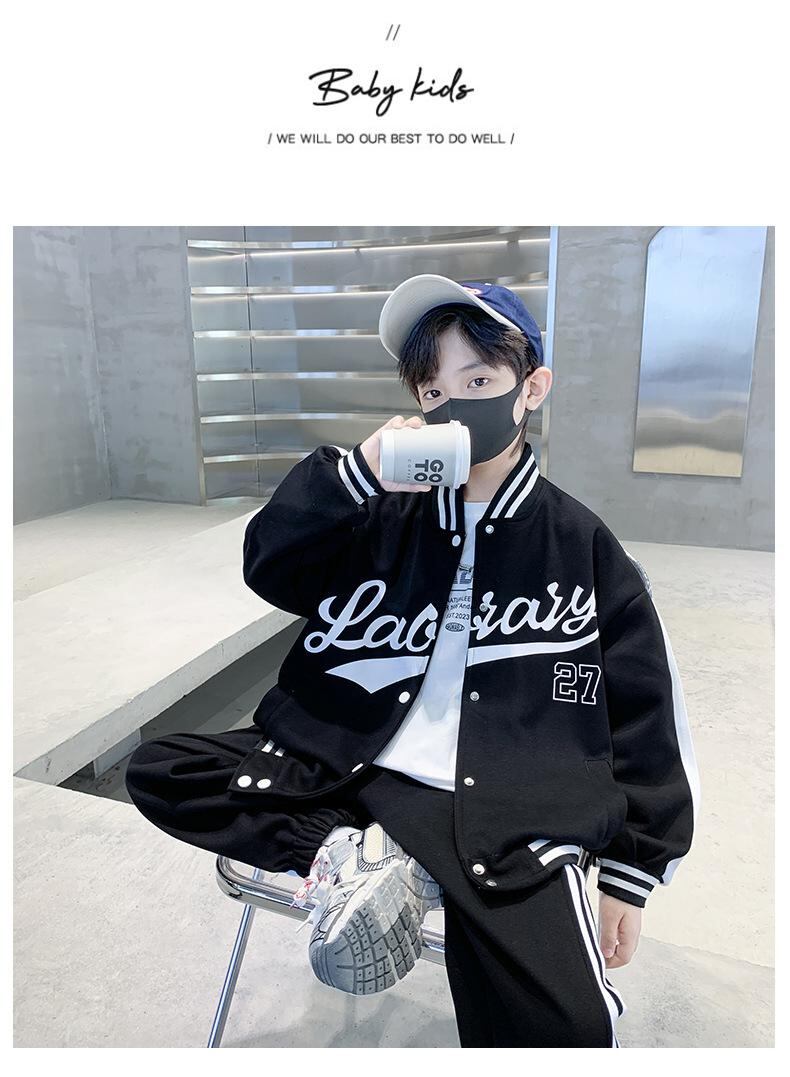 キッズ 男の子用 ベースボール セットアップ 秋冬 スポーツウェア 上下セット 2点セット 長袖 トップス 長ズボン 綿 伸縮性 普段着 部屋着 ブラック