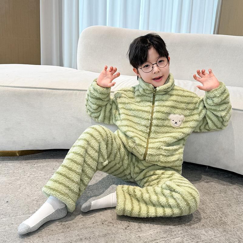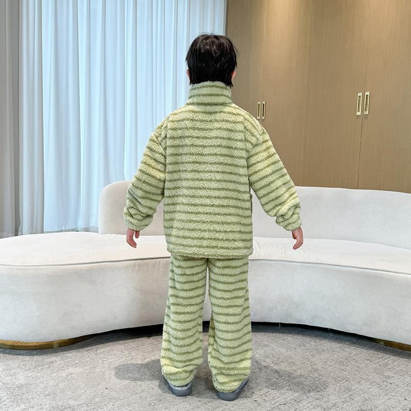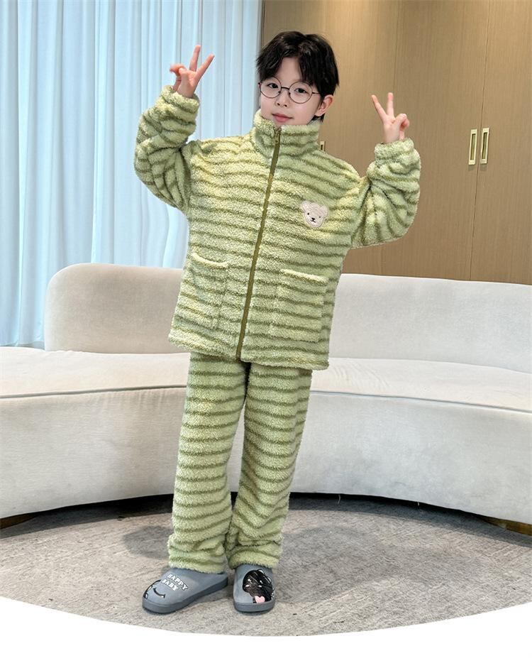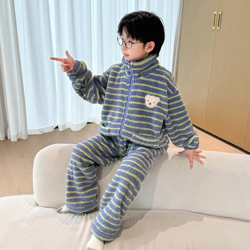 子供服 男の子 パジャマ 秋冬 厚手 フランネル 中大童 上下セット ルームウェア 寝巻き ボーイズ 暖かい 綿 ストライプ クマ柄 パープル グリーン 110cm 120cm 130cm 140cm 150cm 160cm 170cm