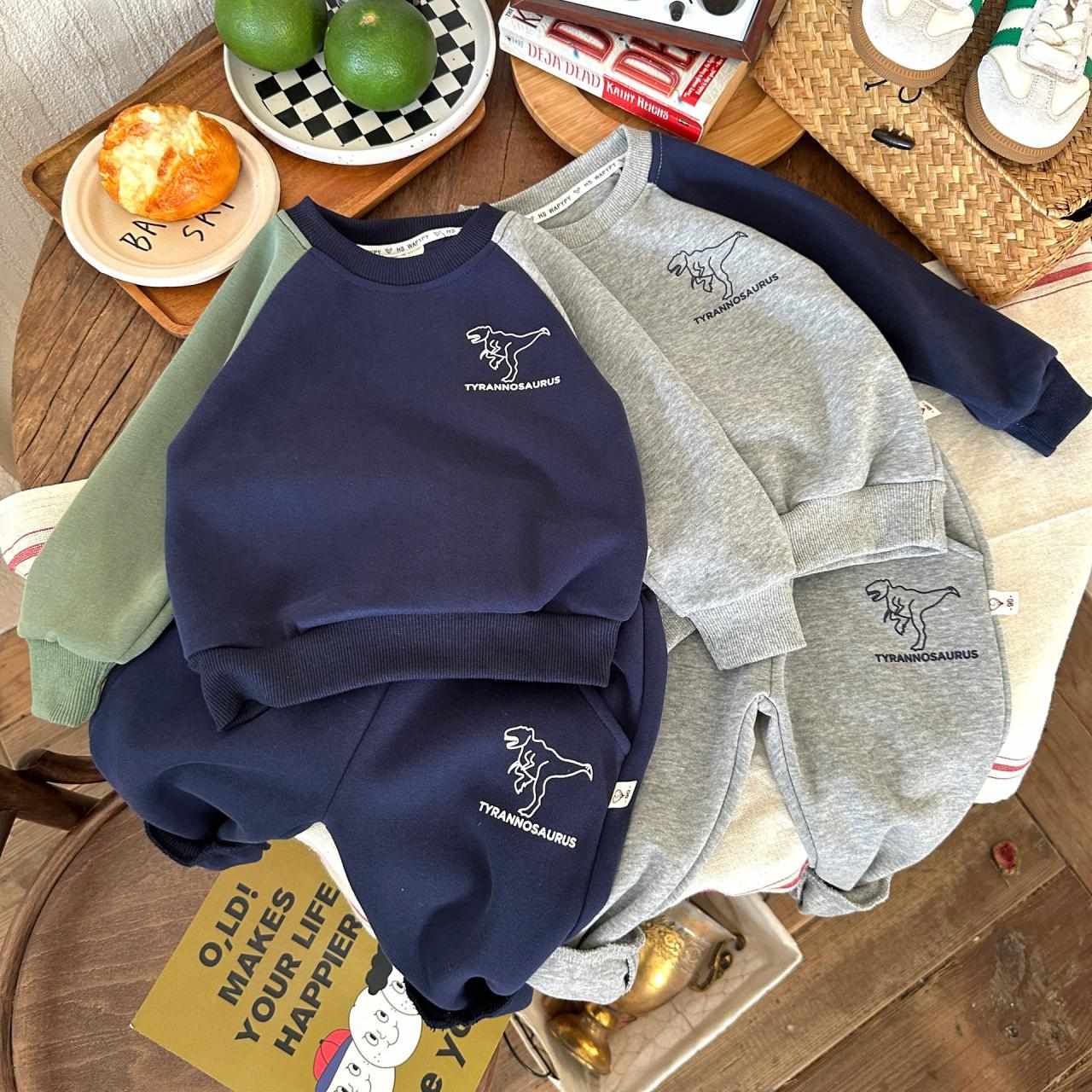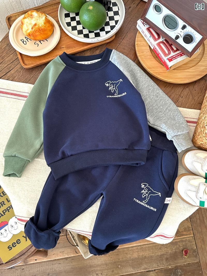 子供服 上下セット 子供服 長袖 トレーナー ロングパンツ 男の子 恐竜 プリント 切り替え 普段着 部屋着 グレー ブルー 綿75%