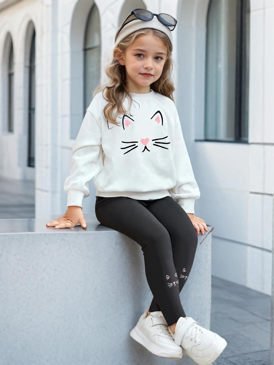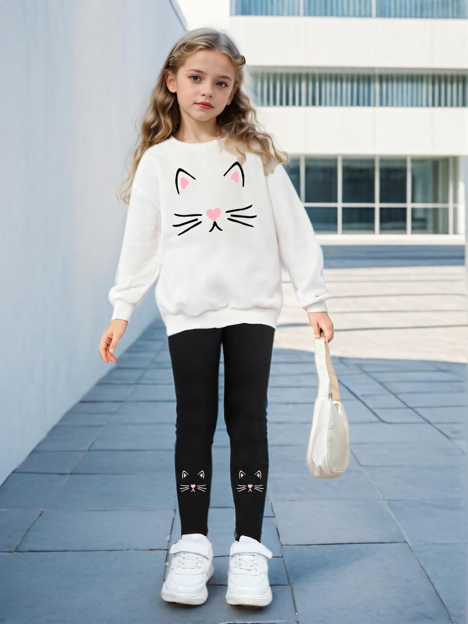 キッズ ガールズ スウェット トレーナー & 猫 プリント 長袖 トップス + スキニー パンツ 2点セット 秋冬 普段着 部屋着 アウトドア