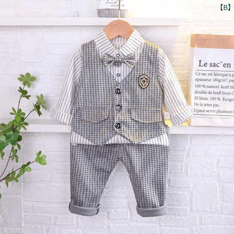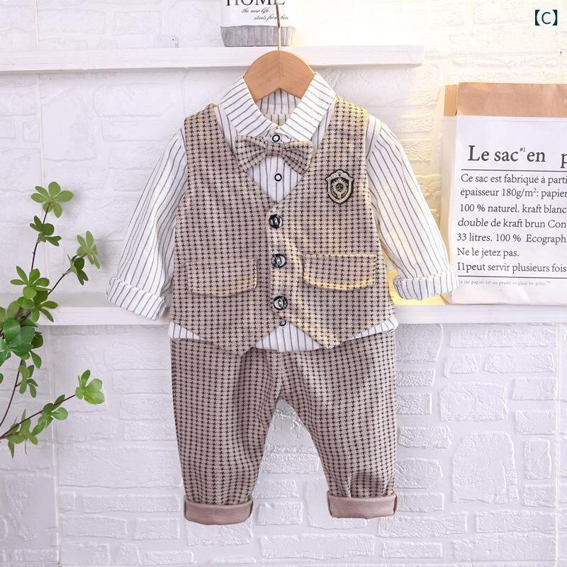 子供用フォーマルウェア キッズ 男の子 春秋物 ストライプシャツ 長袖 格子柄ベスト カーディガン 3点セット 幼児 普段使い 発表会 結婚式 হালকা グレー系 ブラック系