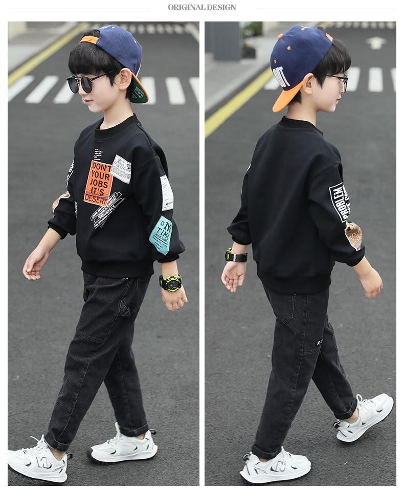 キッズ 男の子 トレーナー トップス カットソー 長袖 綿100% プルオーバー スウェット 部屋着 普段使い 春秋 スポーツ アルファベットプリント ブラック デニムブルー