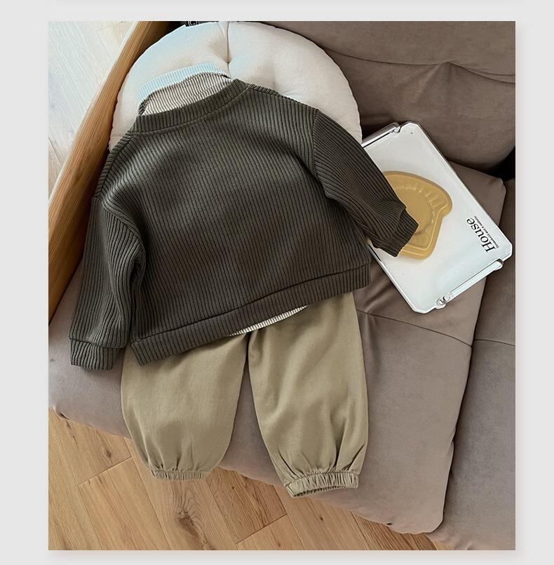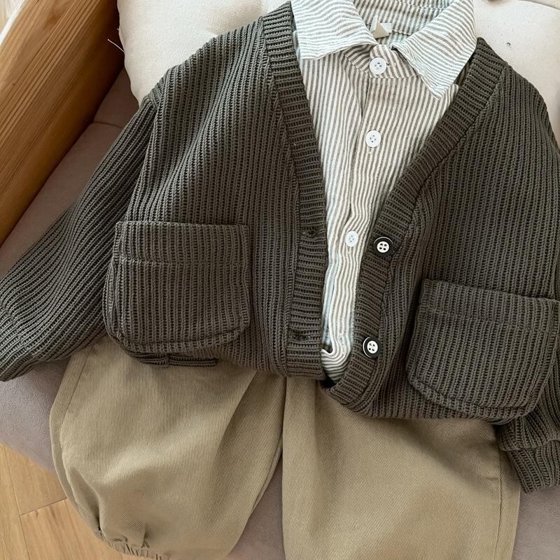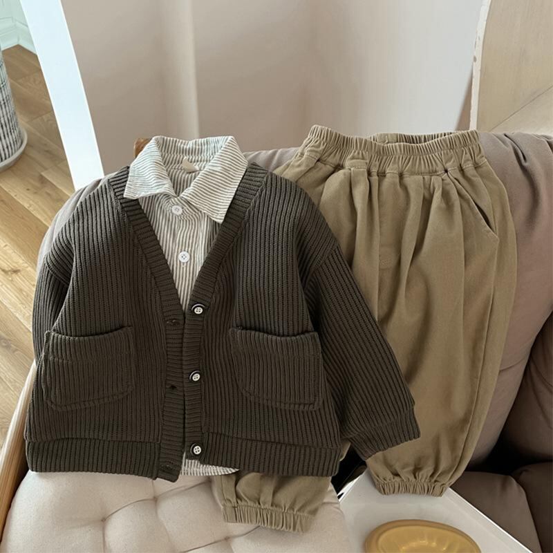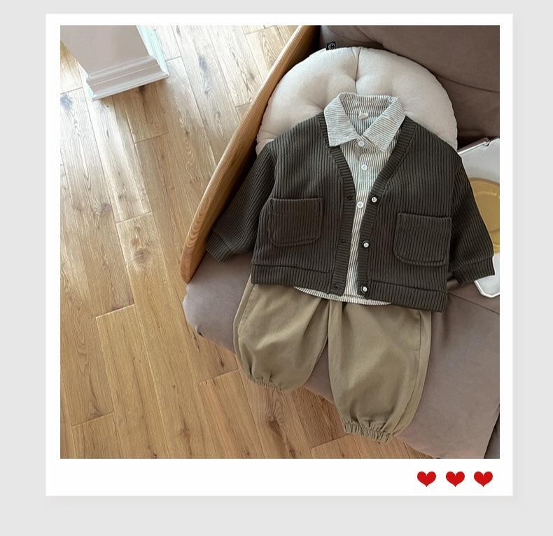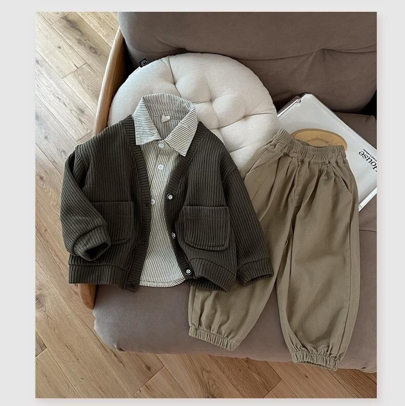 キッズ 男の子 ニット カーディガン ストライプ シャツ 長ズボン 3点セット カジュアル 春秋 長袖 コットン 柔らかい