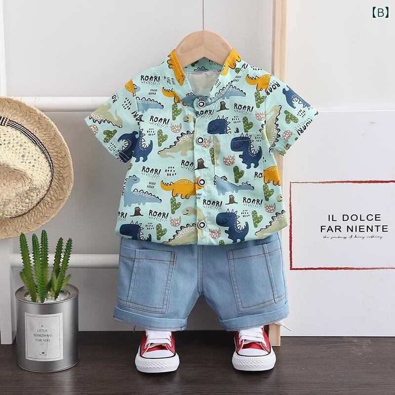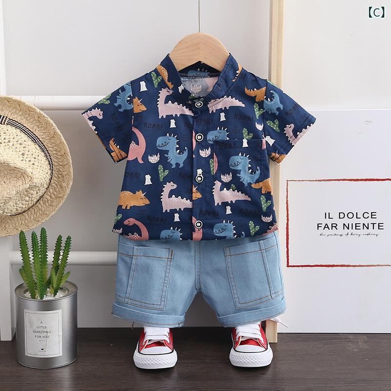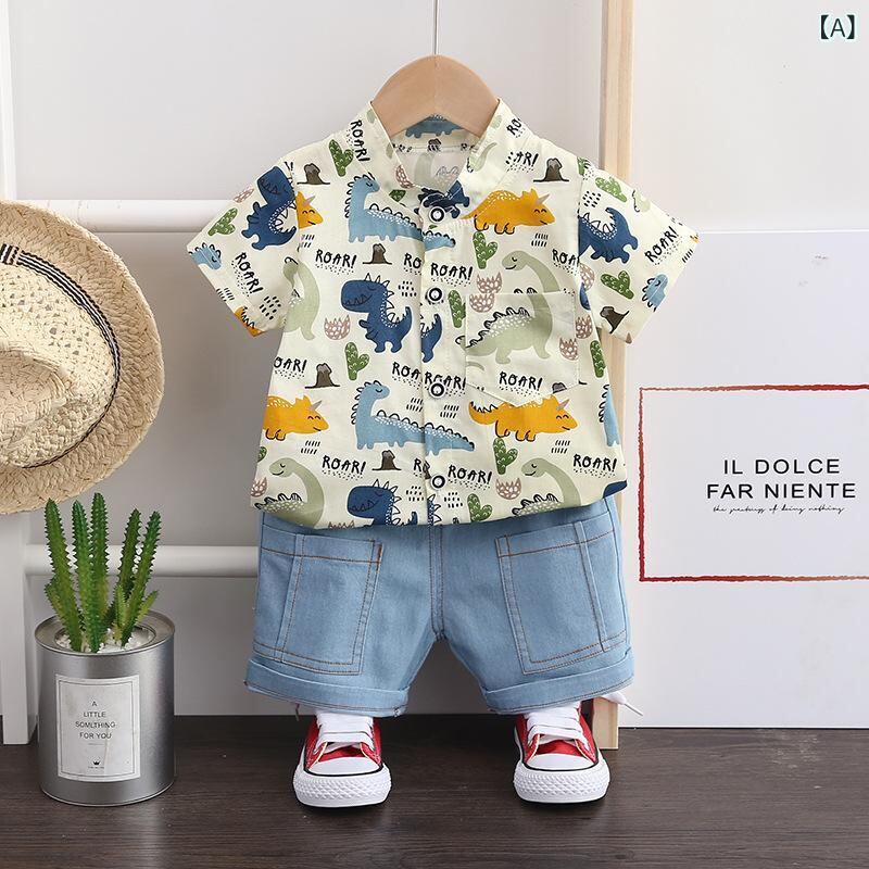 キッズ ベビー服 男の子 半袖シャツ 7分丈パンツ 上下セット 薄手 綿 カクタスプリント 恐竜柄 かわいい 普段着 部屋着 春夏