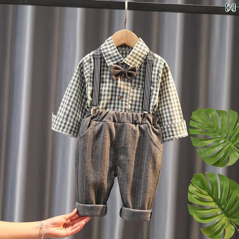 キッズ ベビー服 格子柄 蝶ネクタイ サロペット 長袖 シャツ 2点セット 春秋 男の子 幼児 綿100%