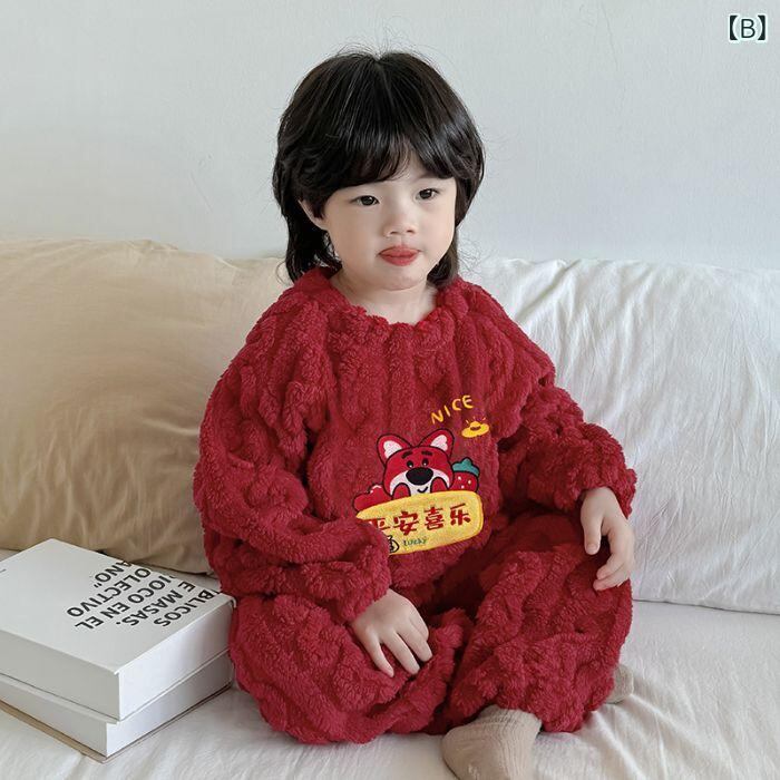 子供用パジャマ 秋冬用 コーラルベロア 男の子 ベビー 赤色 新年 麒麟 福 ベア プリント 厚手 暖か セットアップ