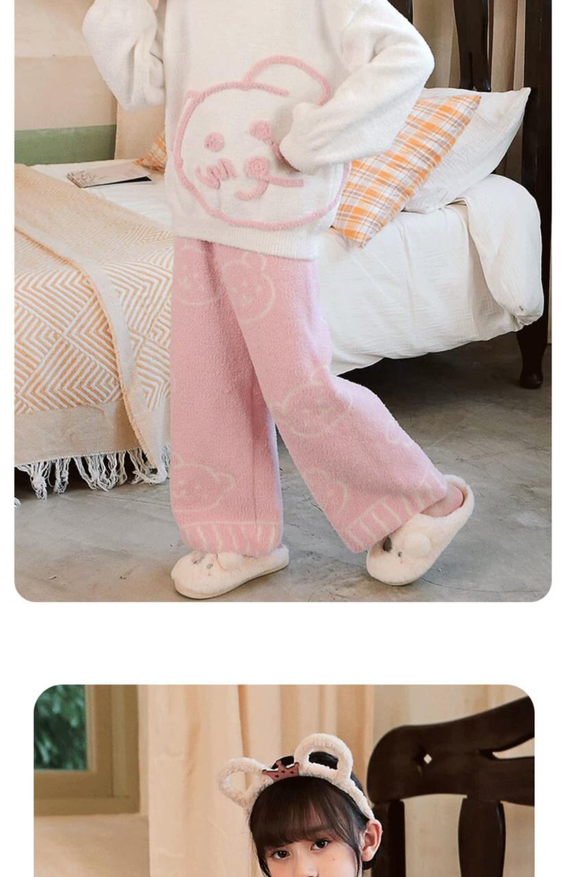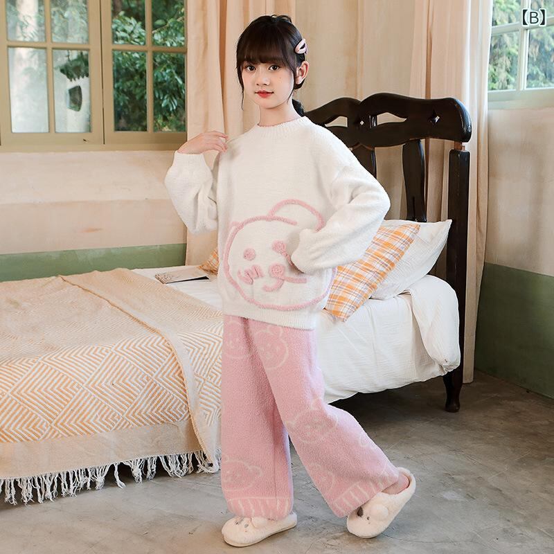 子供用パジャマ 秋冬 女の子 中 बड़ा 子供 フランネル 暖かい 厚手 ニット 部屋着 ピンク 蝶結び ポリエステル100% 120cm 130cm 140cm 150cm 160cm 170cm