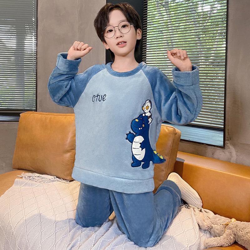 子供用パジャマ 男児向けフランネルルームウェア 上下セット かわいい恐竜柄 接触温感 厚手 秋冬 保温 部屋着 寝巻き 男の子 ボーイズ