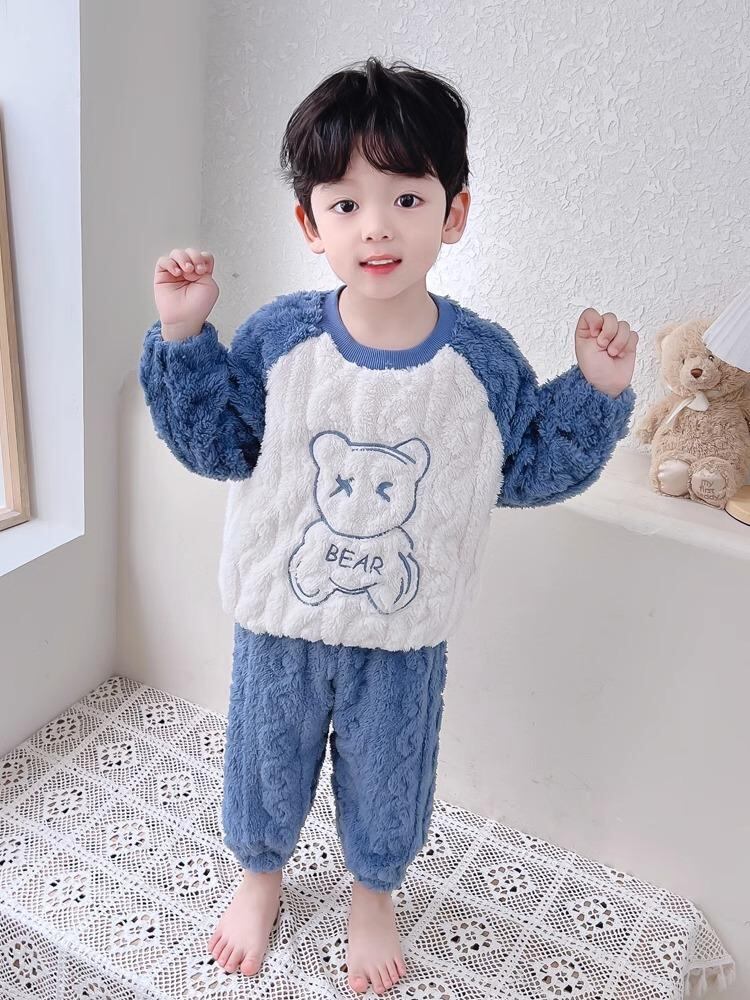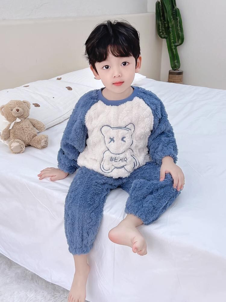 子供服 パジャマ 男の子 小熊柄 フランネル 暖かい 厚手 秋冬 ブルー かわいい 部屋着 ルームウェア 80 90 100 110 120 130