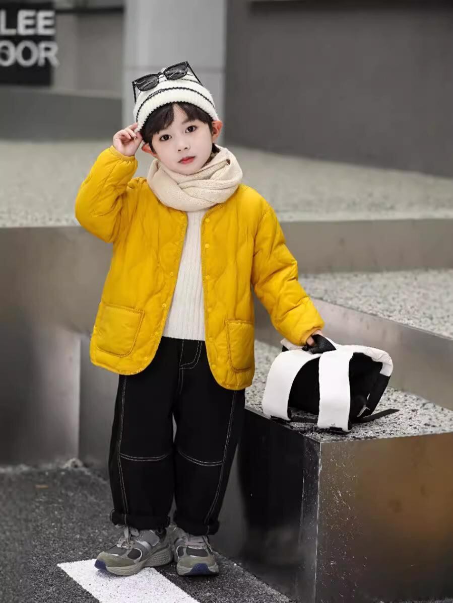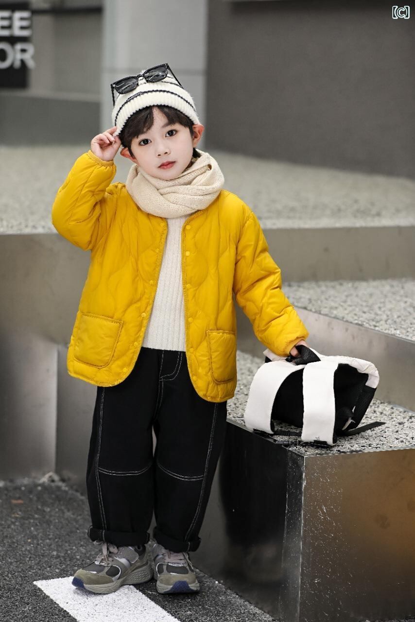 子供服 子供用羽毛ジャケット 薄手 軽量 インナーダウン ショート丈 男女兼用 90% ダウン ラウンドネック 無地 春秋冬 ブラック レッド イエロー ピンク パープル
