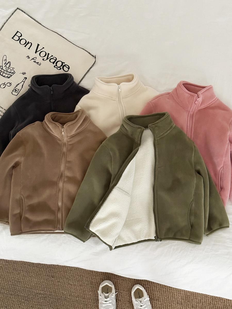 子供用フリースジャケット 秋冬 男女兼用 裏起毛 暖かい 厚手 アウター 普段使い 韓国風 緑 ピンク系 白 灰色 茶色