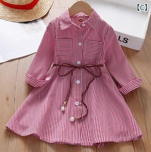 ワンピース 子供服 女の子 ストライプ柄 シャツワンピース 春秋 長袖 膝丈 プリンセススタイル かわいい おしゃれ ピンク系 ブルー系 レッド系 ベージュ 90cm 100cm 110cm 120cm 130cm 140cm