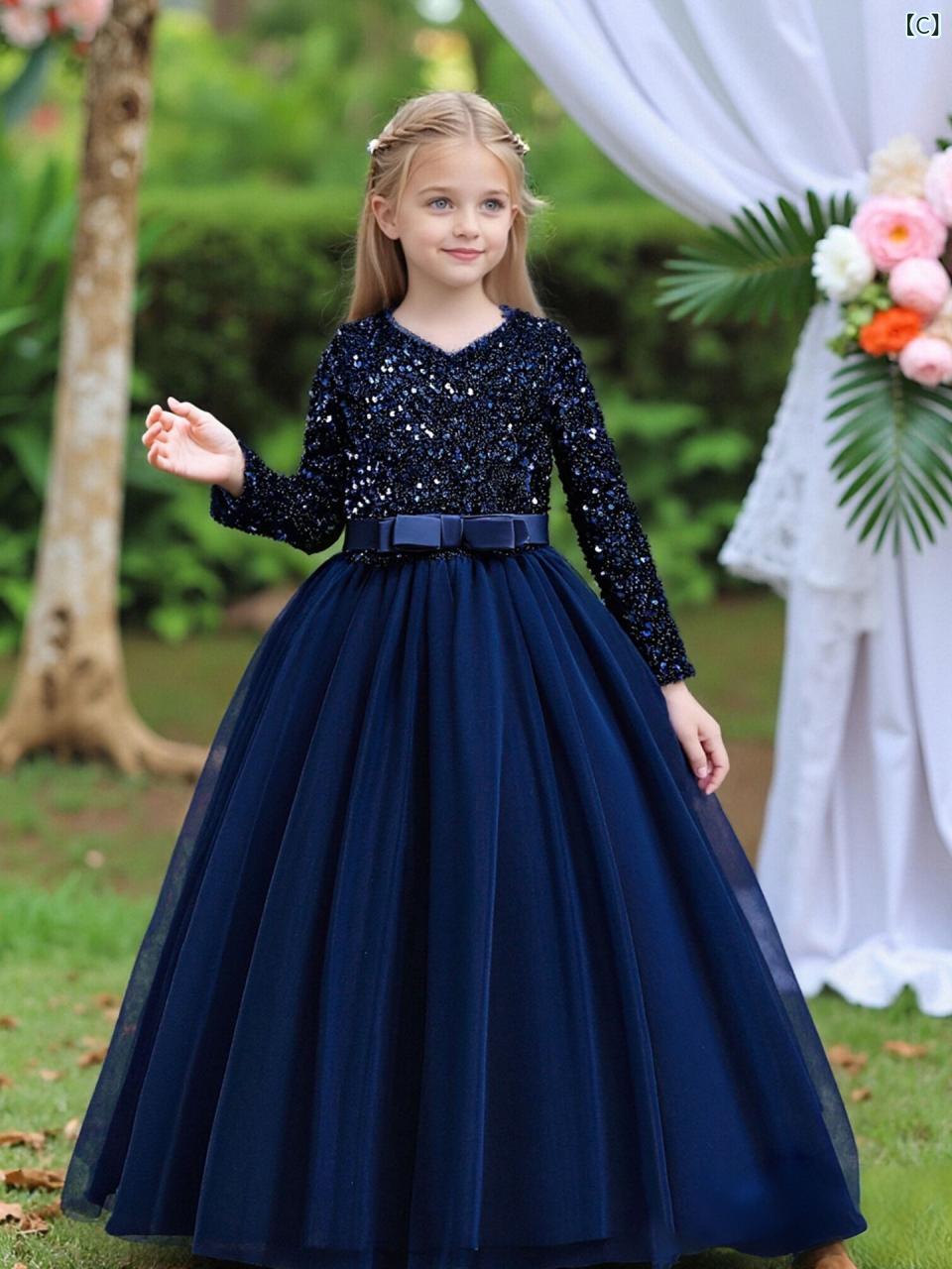 子供用ドレス 女の子 プリンセスドレス ロングワンピース スパンコール チュールスカート 発表会 結婚式 パーティー 演奏会 かわいい 蝶結び リボン グレー グリーン ネイビー ワインレッド 120cm 130cm 140cm 150cm 160cm