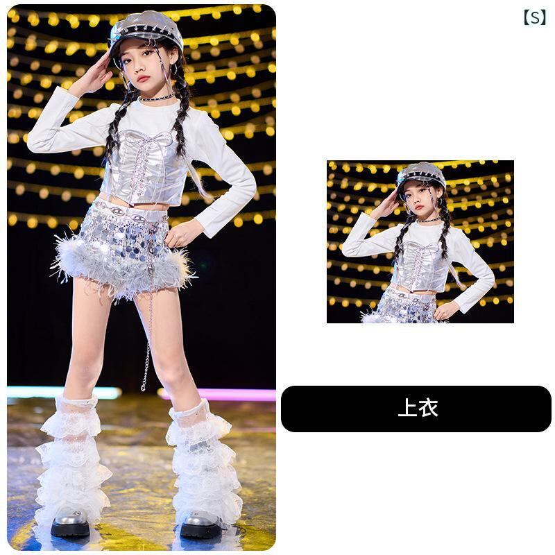 ダンス衣装 女の子 ジャズダンス ヒップホップ 子供服 トップス パンツ セットアップ キッズ チアガール 舞台 演出服 ショー ベレー帽 チョーカー ウエストチェーン レッグリング レースレッグウォーマー 7144白色長袖 7145銀色短褲