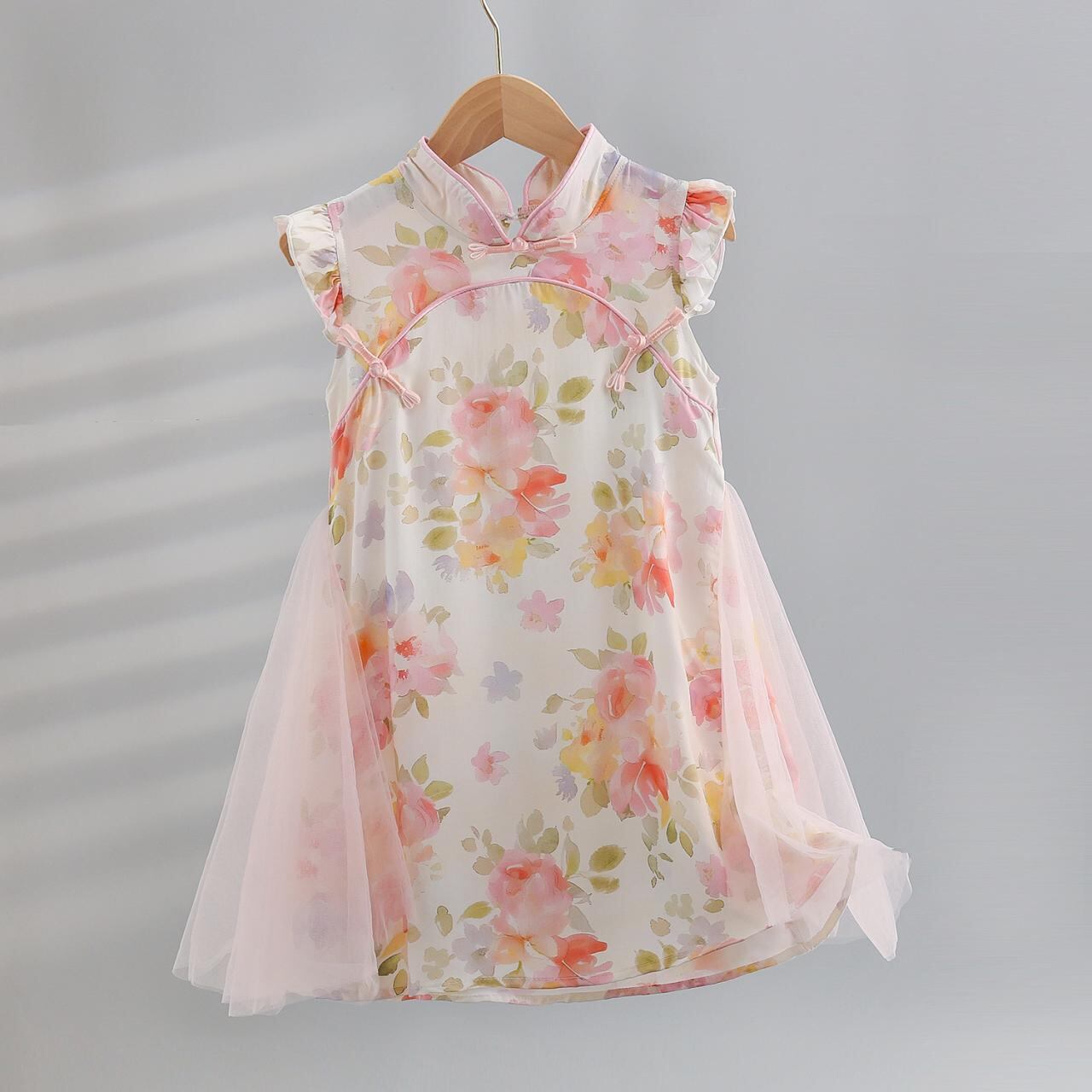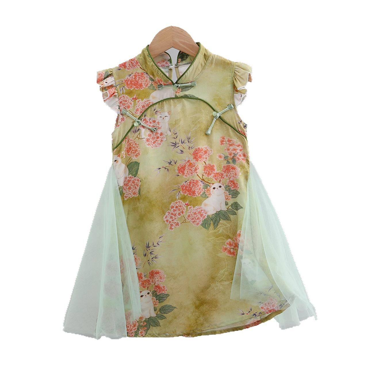 ワンピース 子供 女の子 人造綿 チャイナドレス A字スカート 花柄 ガーリー 春夏 薄手 チュール かわいい おしゃれ 100 110 120 130 140 150 160 グリーン ピンク系