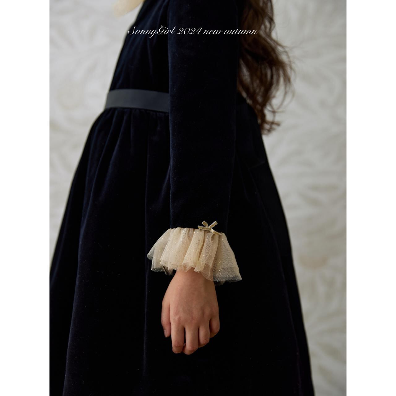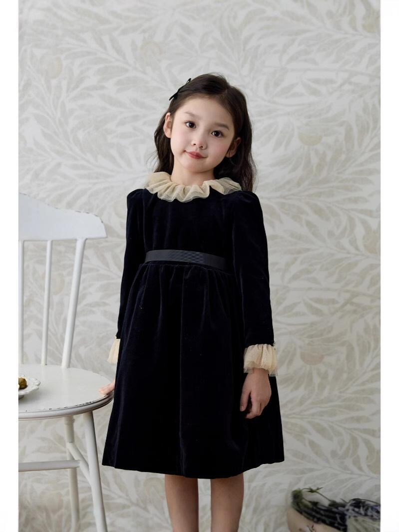 ワンピース キッズ 秋冬 ベルベット 長袖 Aライン チュール レース フリル 発表会 ドレス ブラック 120 130 140 150 160 170