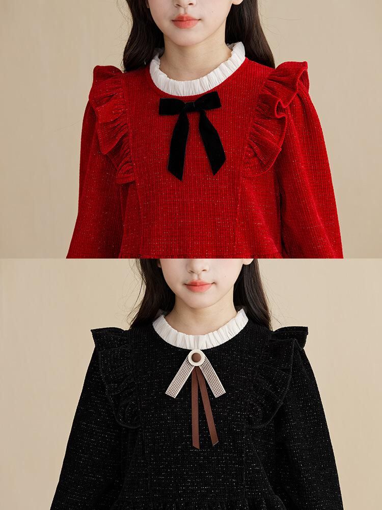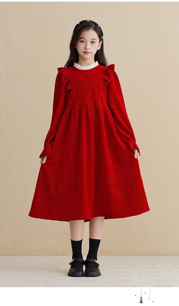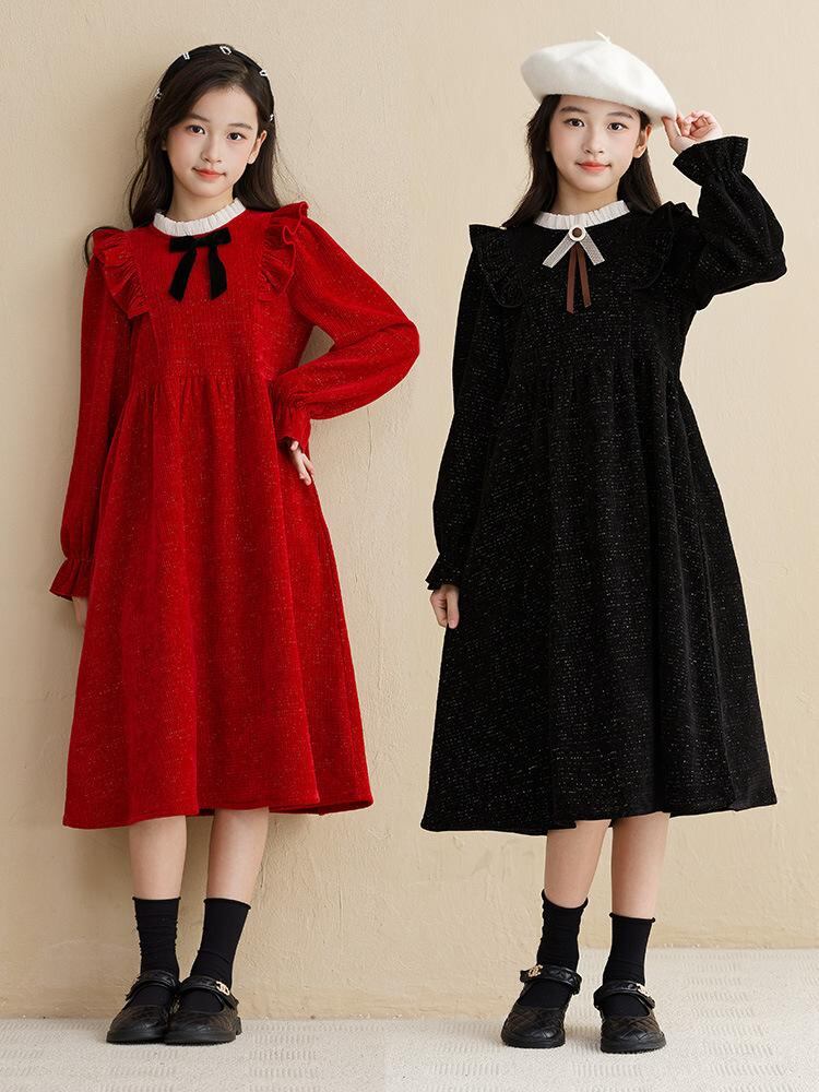ワンピース キッズ 秋冬 レトロ リボン パフスリーブ コーデュロイ 女の子 子供 長袖 Aライン フレア かわいい 発表会 結婚式 パーティー お呼ばれ 120 130 140 150 160 170