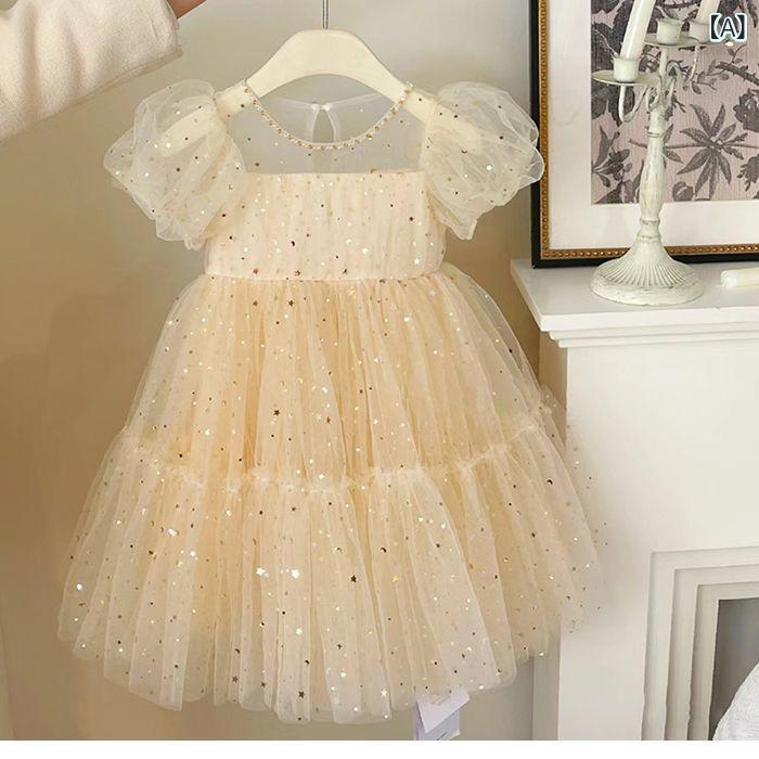 ワンピース 女の子 子供 プリンセスドレス チュール スパンコール パフスリーブ シャンパンカラー かわいい アパレル
