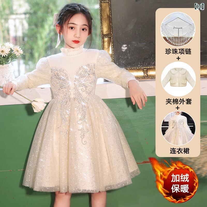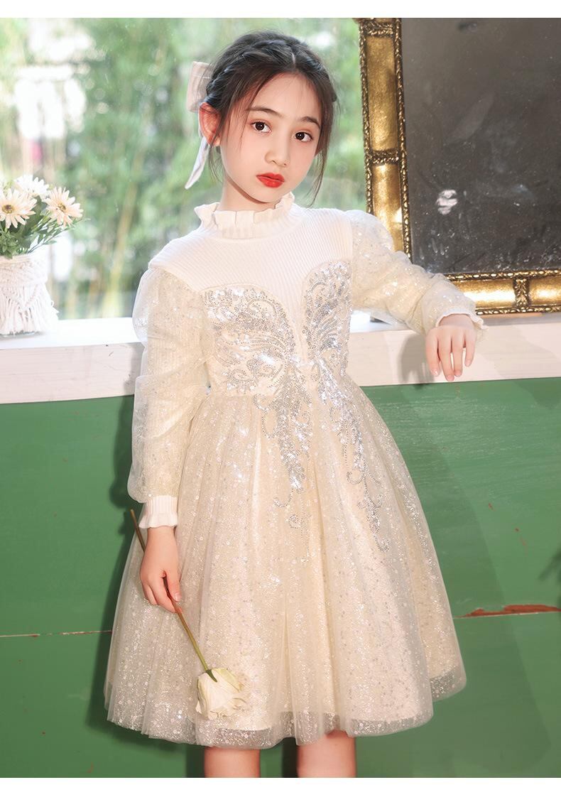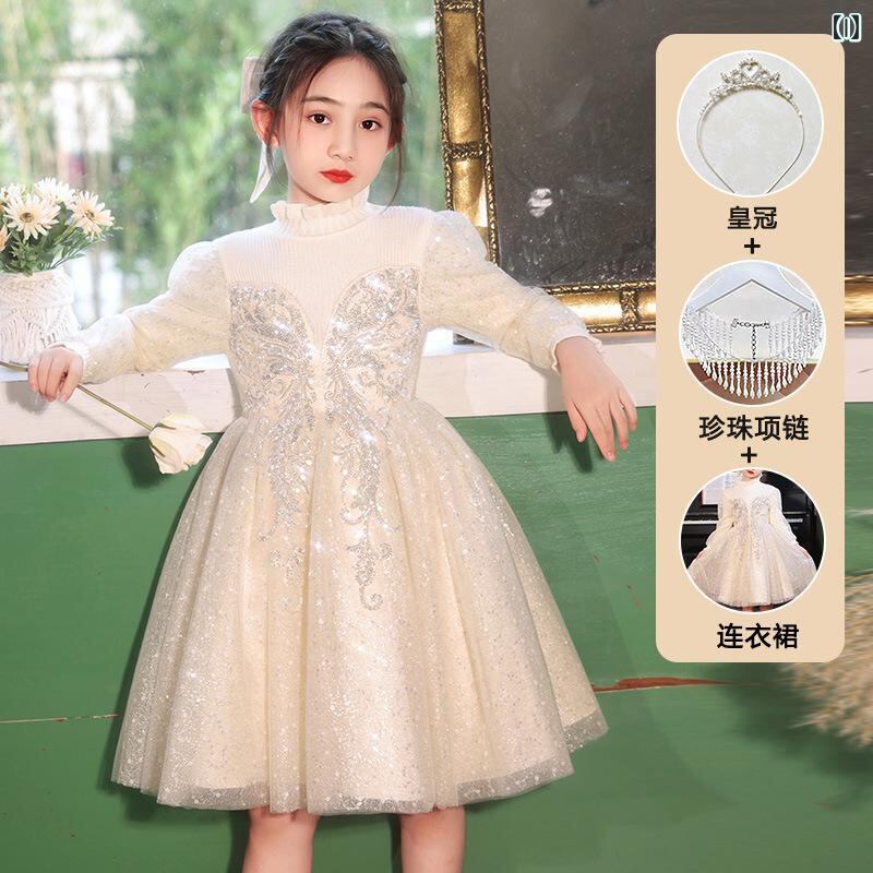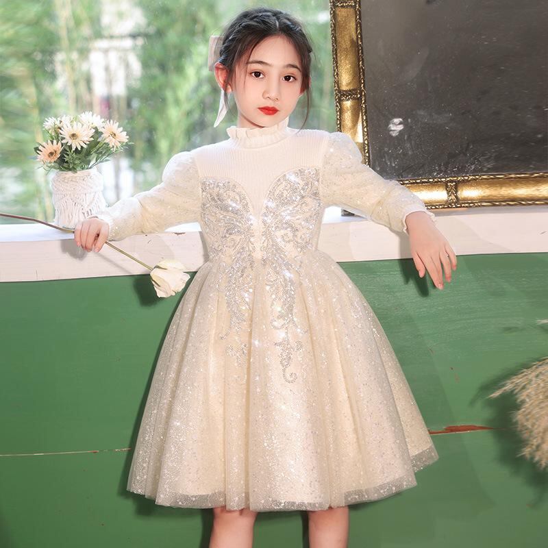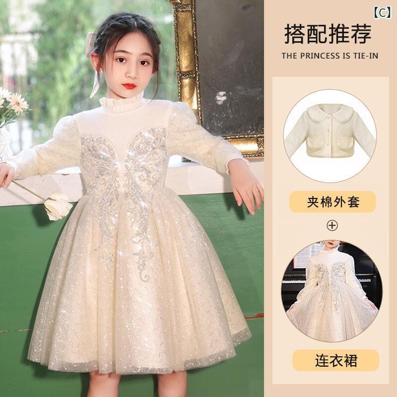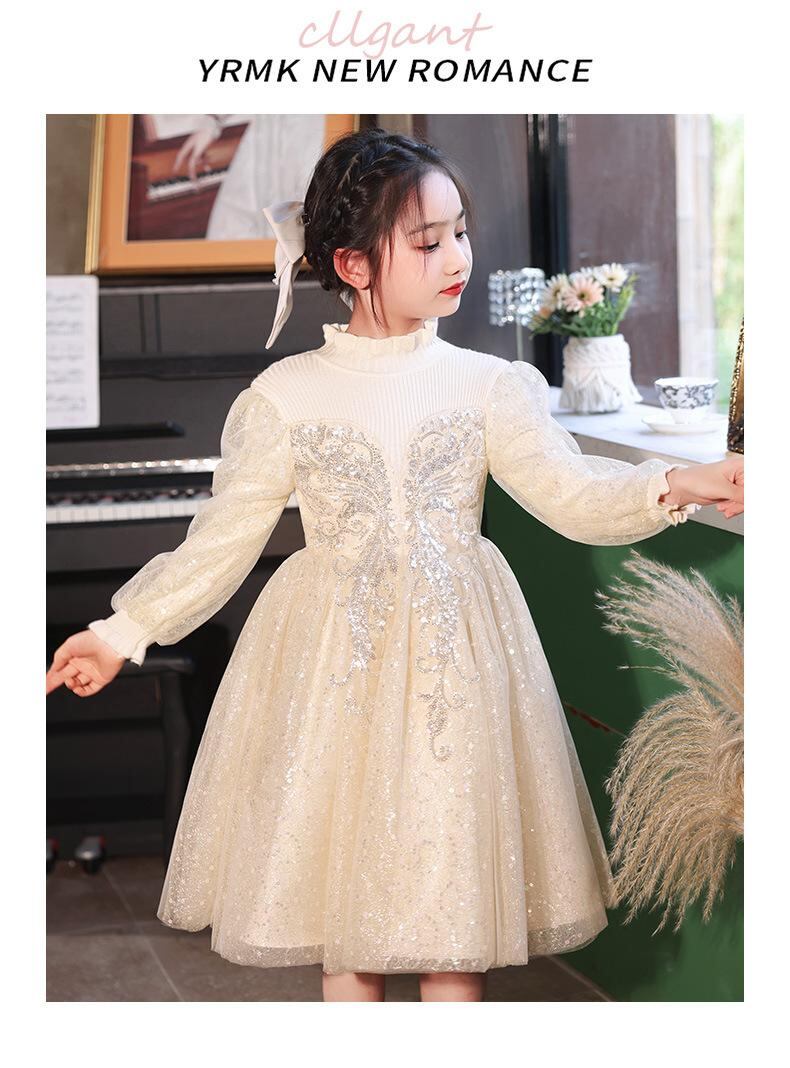ワンピース キッズ 女の子 子供服 裏起毛 Aライン プリンセス ドレス チュール スパンコール フリース シャンパン ゴールド パーティー 発表会 結婚式