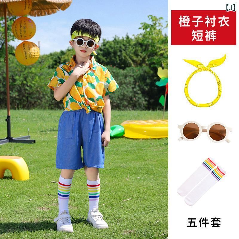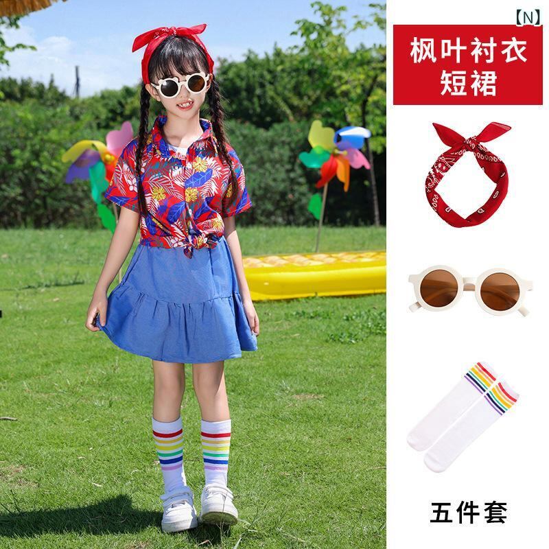 子供 ダンス衣装 花柄シャツ 半袖 短パン ジーンズ スカート セットアップ 幼稚園 小学生 運動会 発表会 ローズレッド オレンジ イエロー 綿 ポリエステル