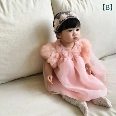 ベビー ワンピース 春夏 韓国風 女の子 プリンセス スカート チュール 新生児 赤ちゃん 花柄 かわいい 柔らかい 肌に優しい ベージュ ピンク系 66cm 73cm 80cm 90cm 100cm