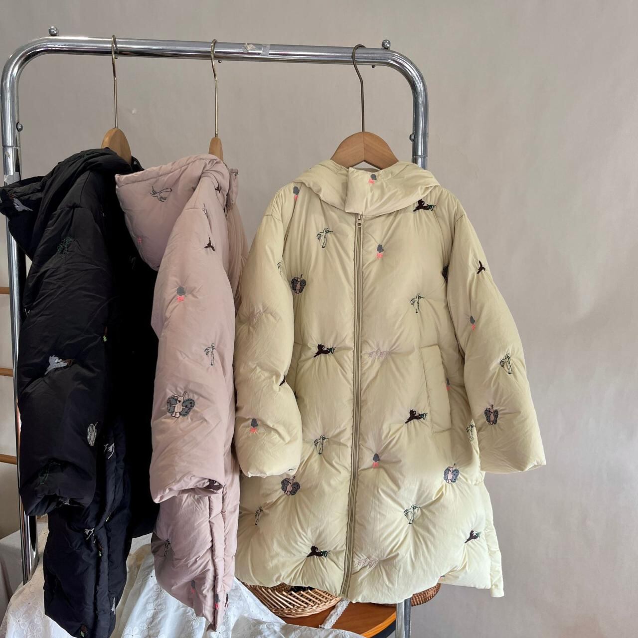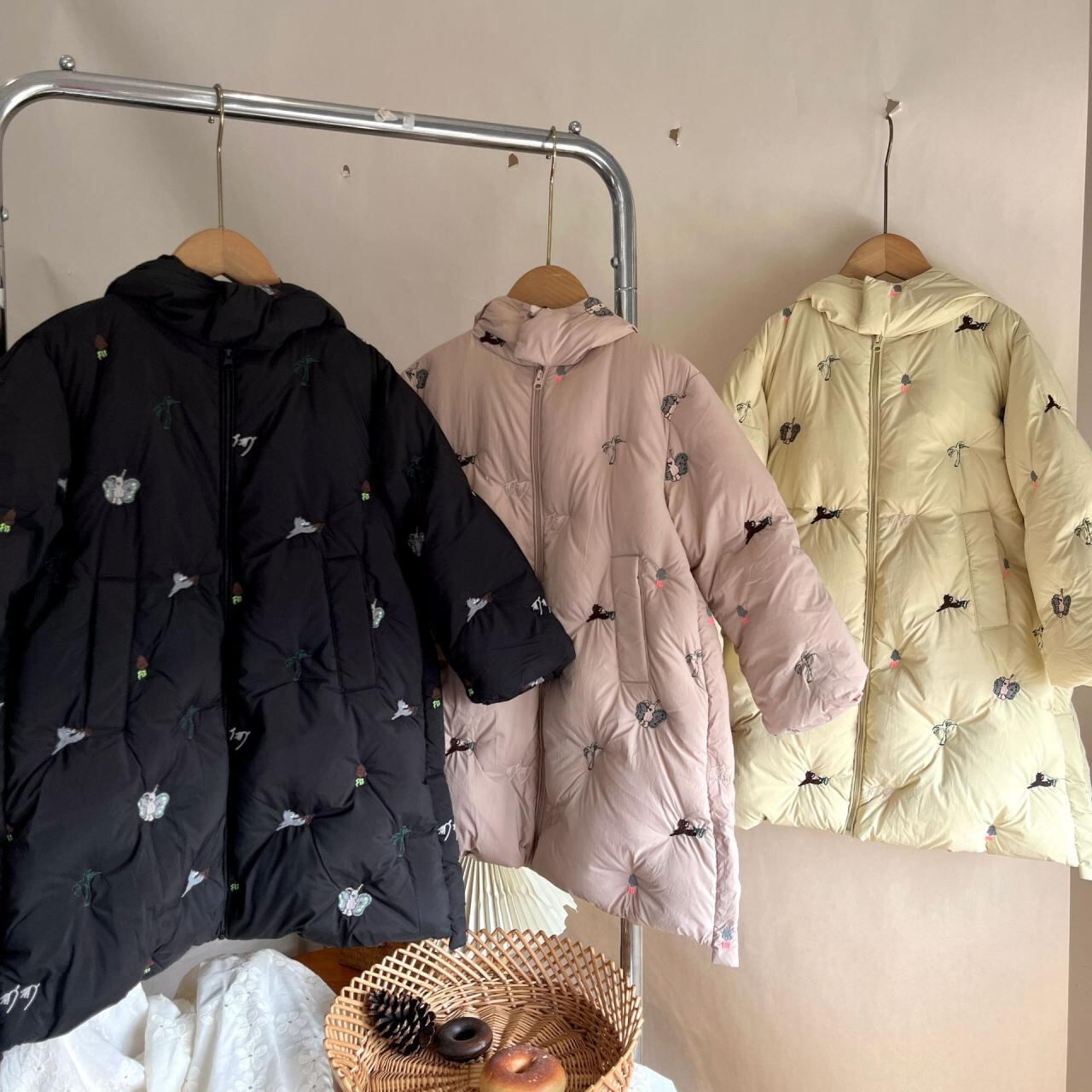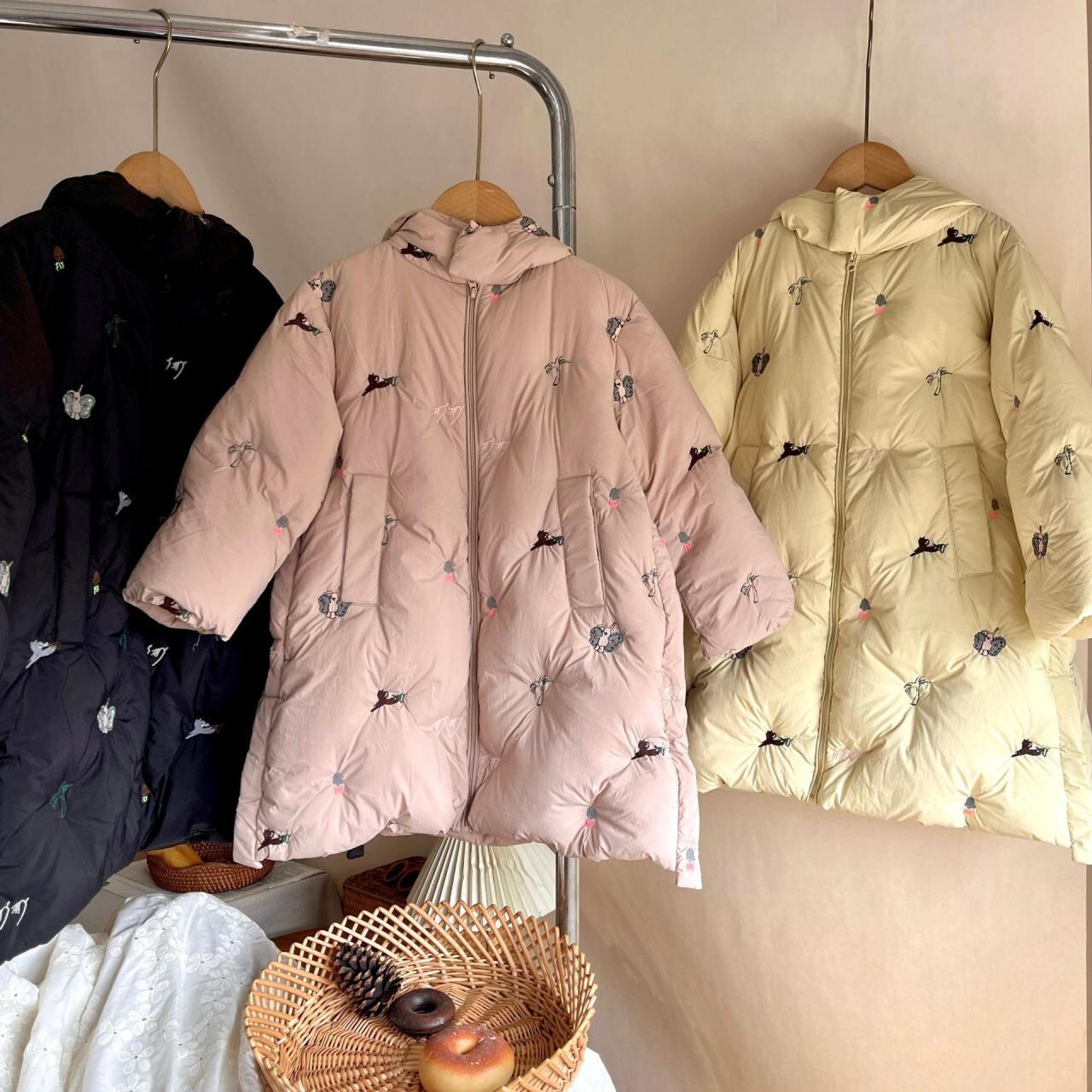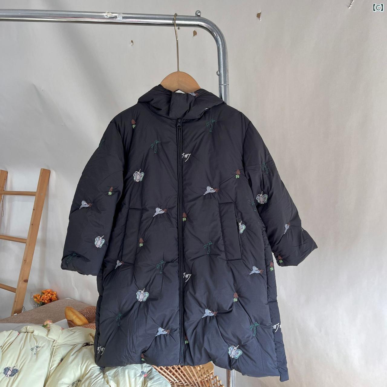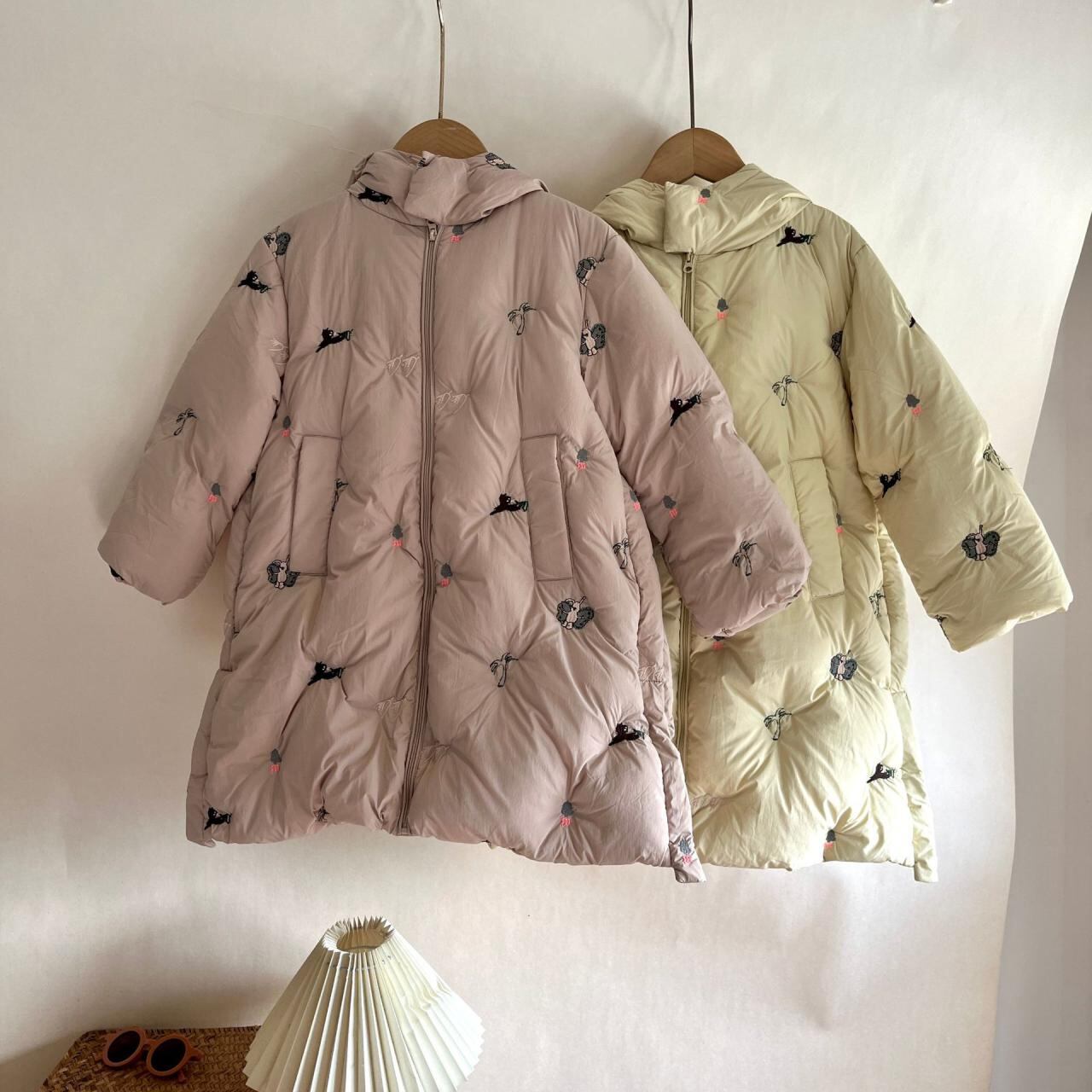 子供服 ダウンジャケット ガールズ アウター ロング丈 秋冬 90% 暖か 白ダックダウン フード付き かわいい カジュアル 動物柄 ゆったり 淡黄 藕粉 ブラック 80 90 100 110 120 130 140