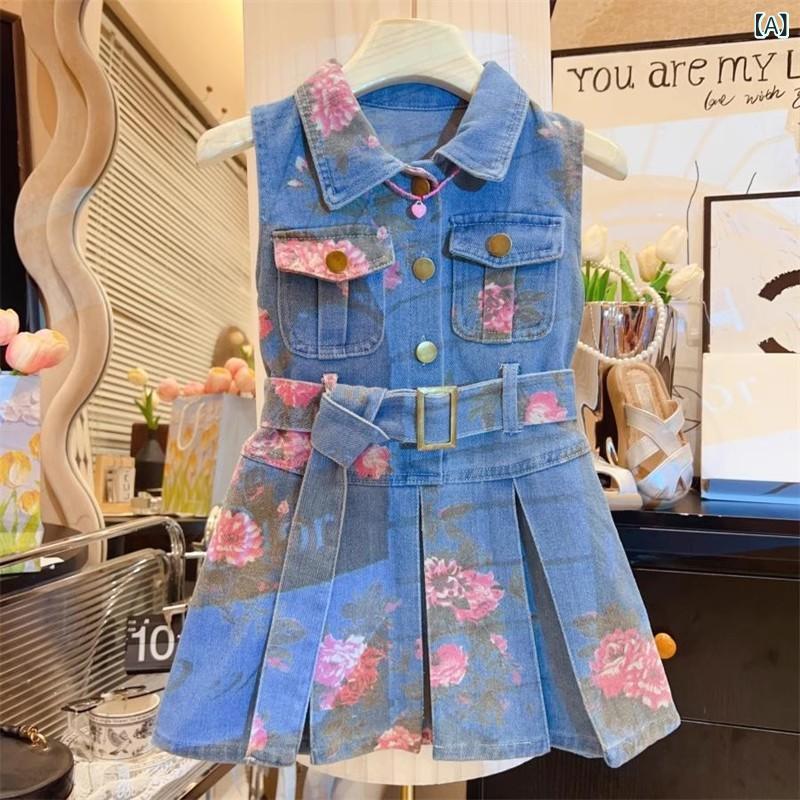 ワンピース キッズ 女の子 子供 ノースリーブ デニム Aライン スカート チュニック 膝丈 発表会 普段着 かわいい 綿70% グリーン 花柄 春夏