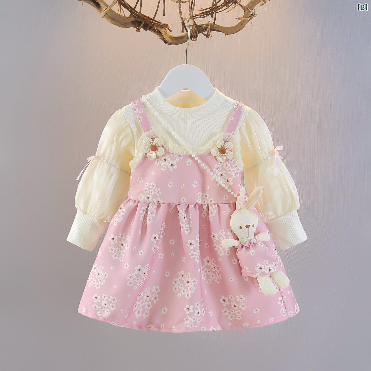 ワンピース 女の子 キッズ 春秋 チュールスカート 長袖 子供服 かわいい 花柄 プリンセススカート ニット ポリエステル ふんわり 発表会 普段着 おしゃれ ベージュ ピンク系