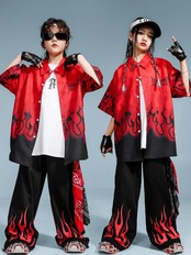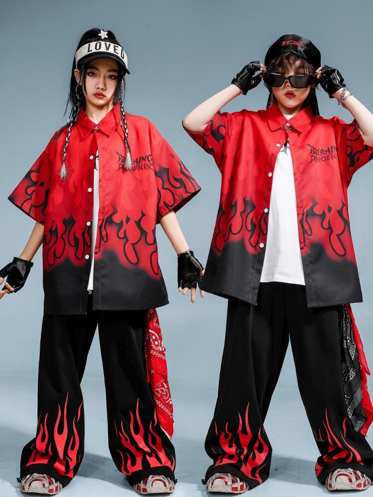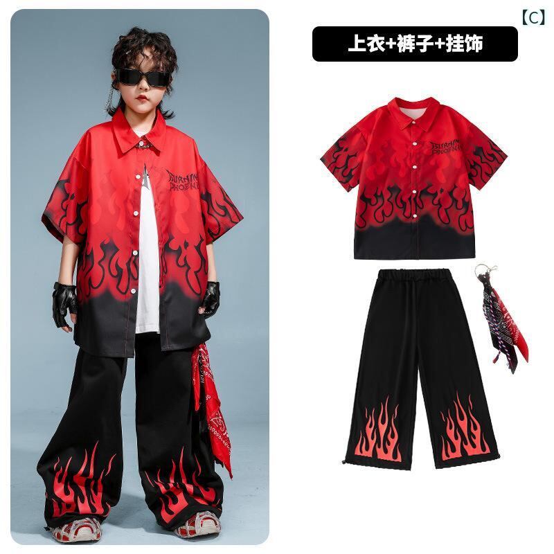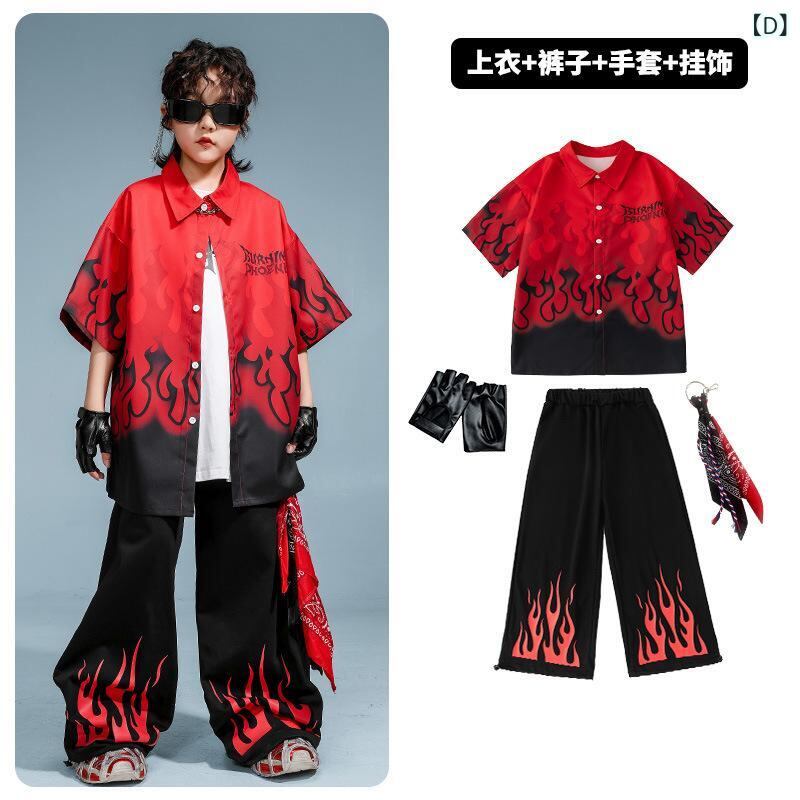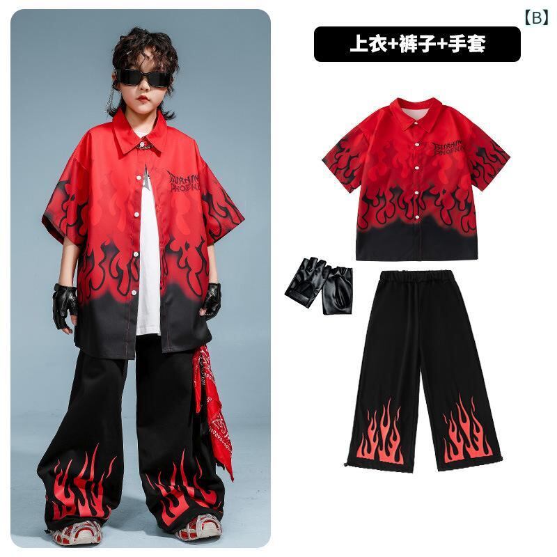 子供用ダンス衣装 セットアップ ヒップホップ 男の子 女の子 ストリート系 練習着 発表会 演出服 半袖シャツ 長ズボン ダンス 黒 赤 綿