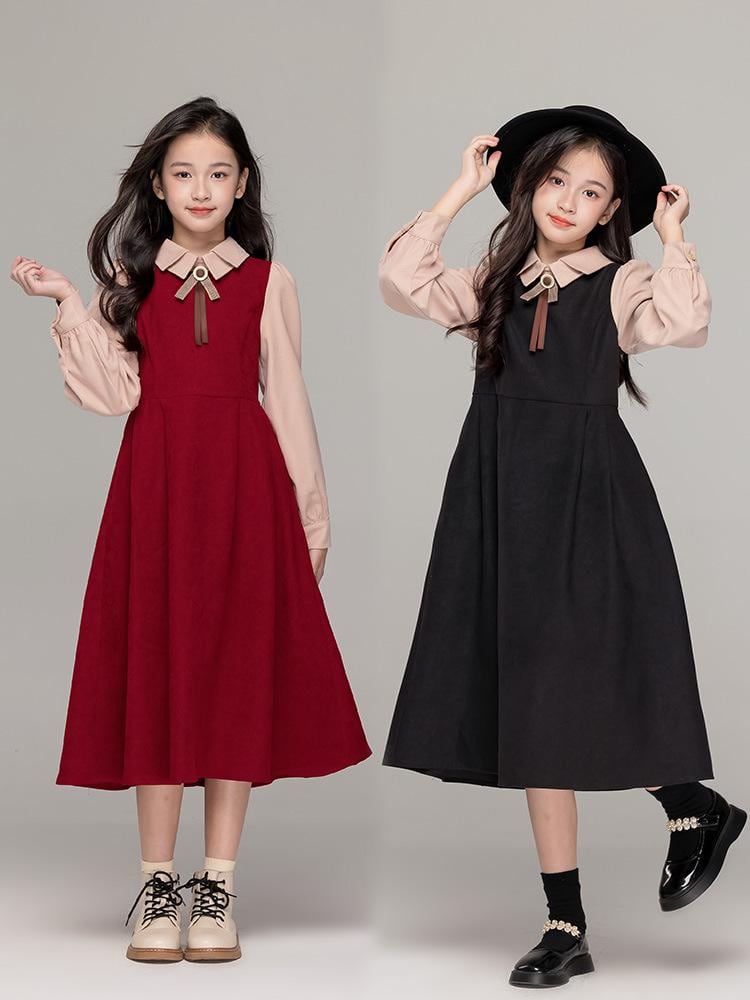 ワンピース 女の子 レトロ 赤 コーデュロイ 秋冬 ダブルレイヤー 配色 切り替え ウエストマーク Aライン 長袖 フォーマル 発表会 結婚式 120cm 130cm 140cm 150cm 160cm 170cm
