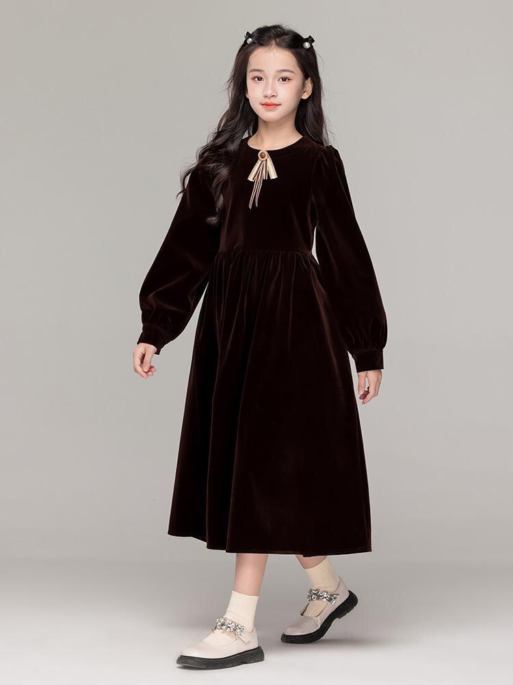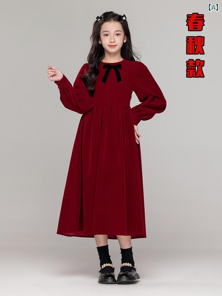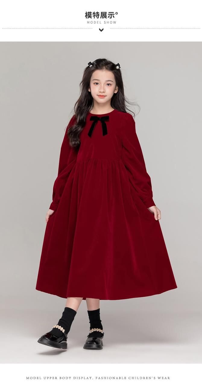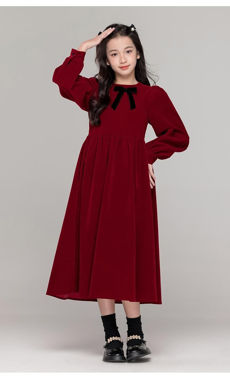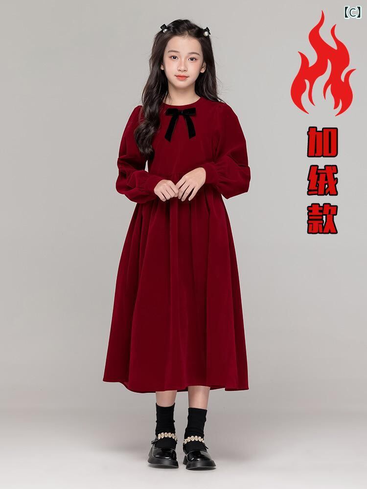 ワンピース 女の子 赤色 学院風 秋冬 長袖 蝶結び かわいい チュールスカート 切り替え Aライン 裏起毛 普段使い 子供服 キッズ ジュニア 120 130 140 150 160 165 170