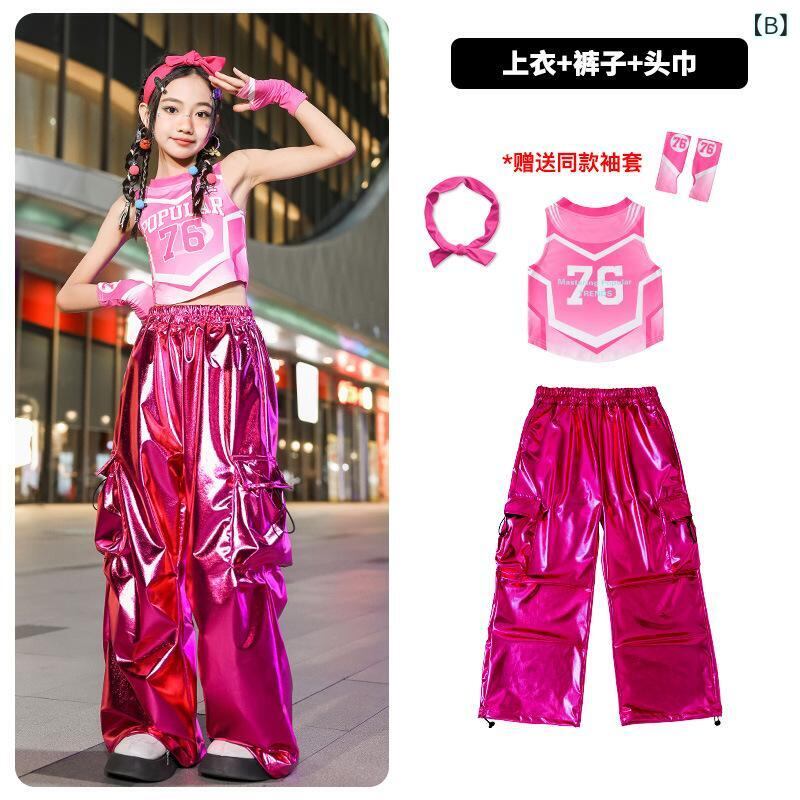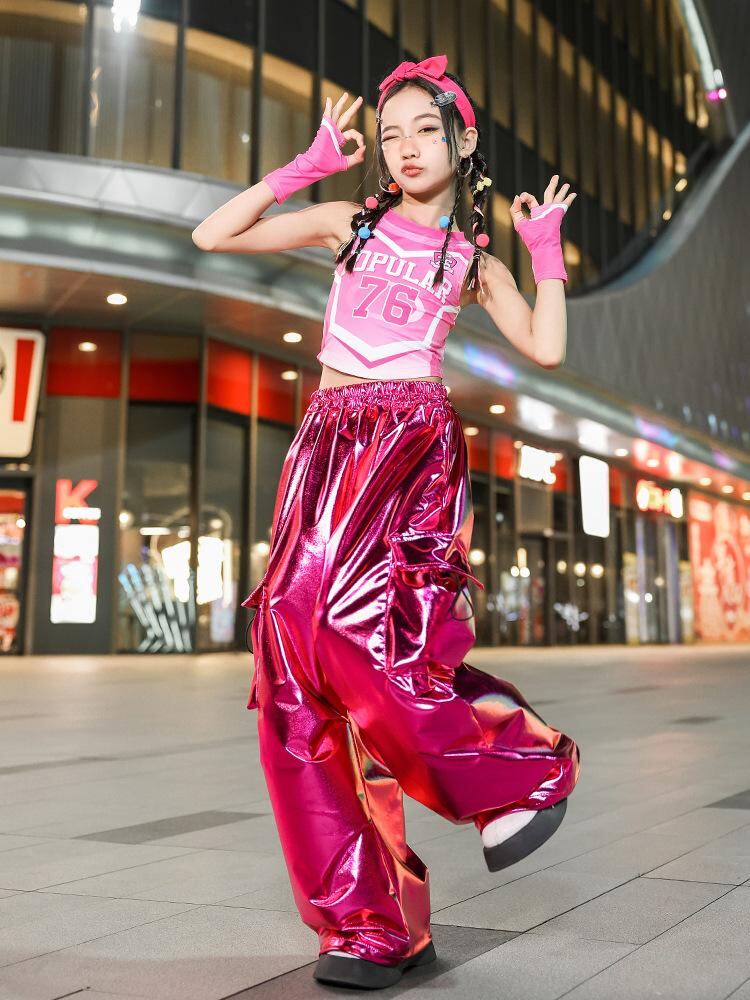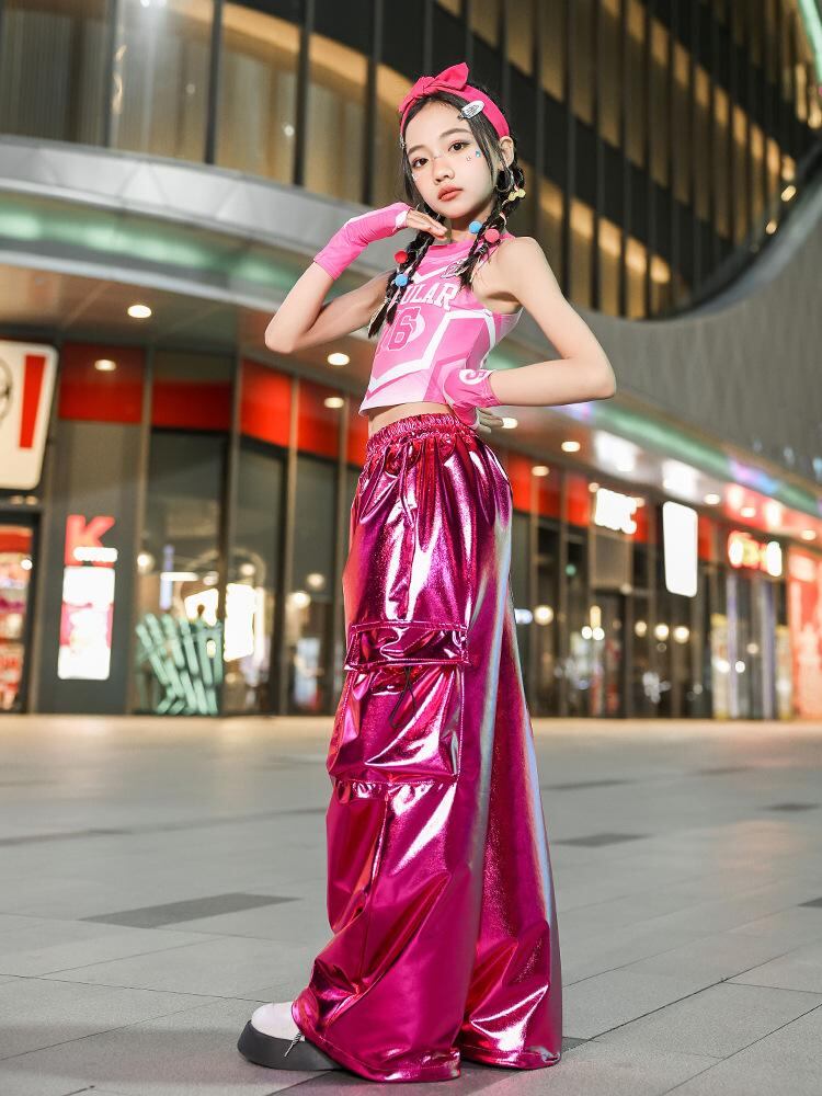ダンス衣装 キッズ ジャズダンス セットアップ へそ出し トップス 光沢 パンツ 女の子 ストリート HIPHOP 練習着 レッスン着 舞台 発表会 110 120 130 140 150 160 170 180
