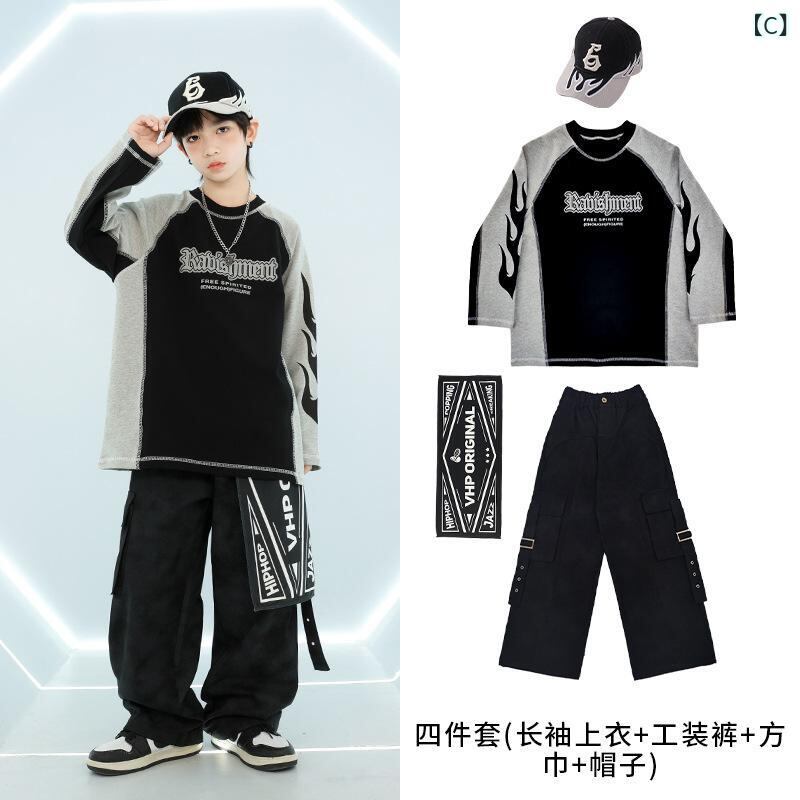キッズ ダンス衣装 ヒップホップ ストリート 上下セット 子供服 男の子 女の子 演出服 長袖トップス カーゴパンツ バンダナ 帽子 アクセサリー付き