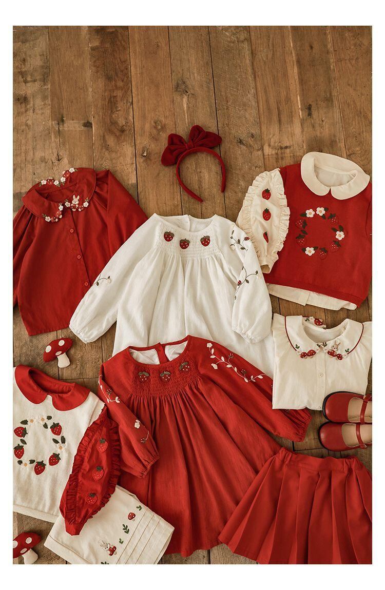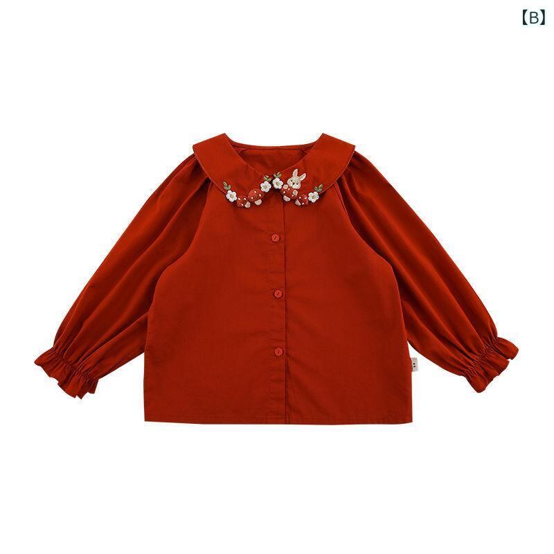 シャツ 女の子 子供服 長袖 刺繡 襟付き コットン100% ブラウス トップス ナチュラル かわいい おしゃれ お出かけ着 ベージュ 赤色