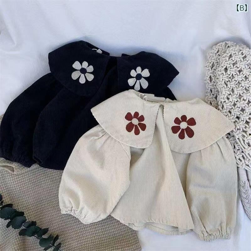 子供服 シャツ 女の子 春秋 長袖 襟付き 花柄 刺繍 ベビー 幼児 トップス 宝藍色 米色