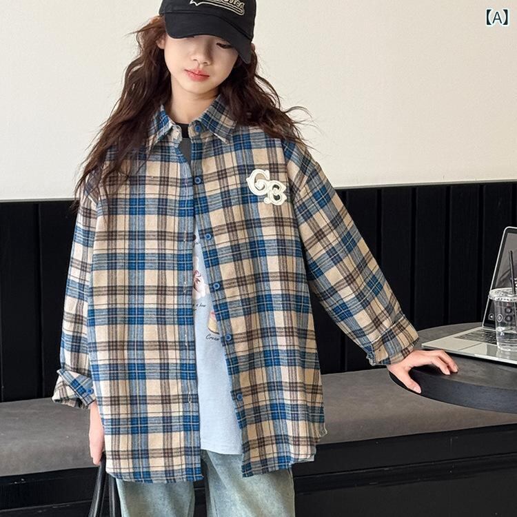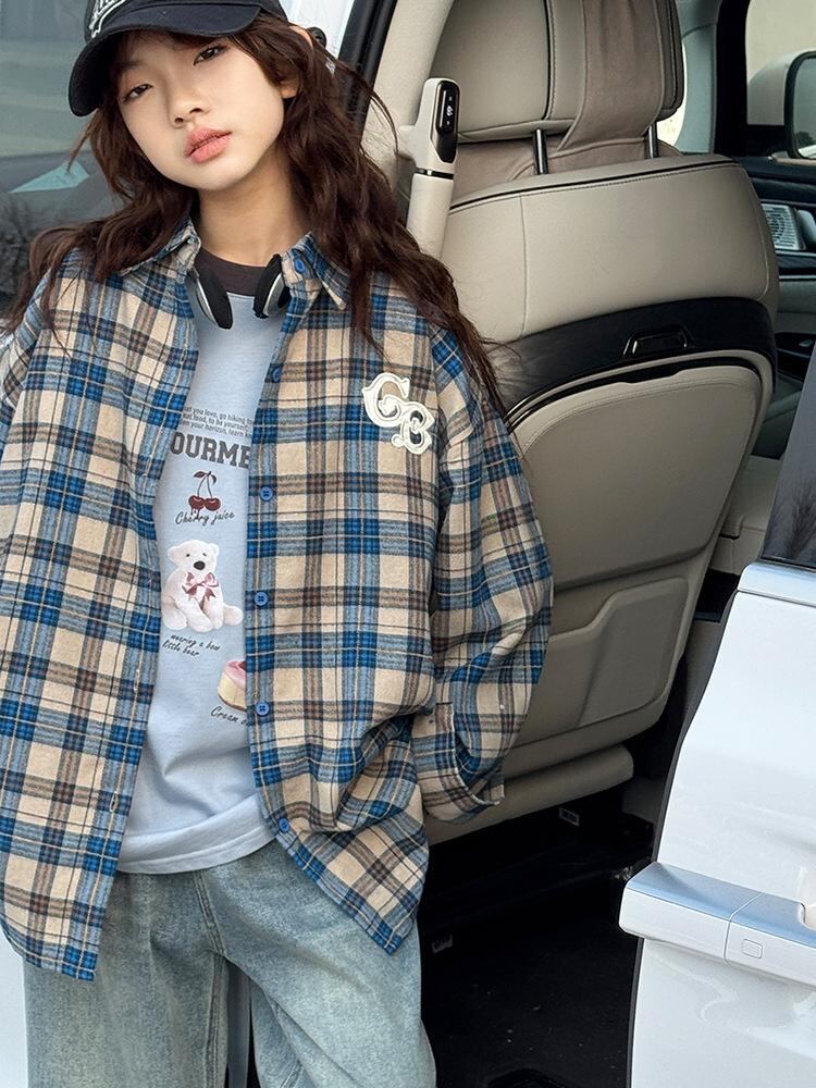 シャツ キッズ 長袖 チェック柄 襟付き ブルー 綿 手作り風 ビーズ 春秋 かわいい おしゃれ カジュアル 普段使い 通学 120cm 130cm 140cm 150cm 160cm 170cm