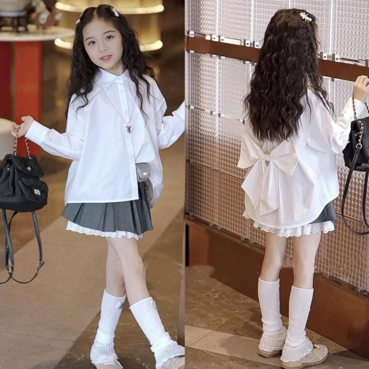 シャツ 女の子 ブラウス プリーツスカート セットアップ 長袖 コットン 春夏 かわいい 蝶結び 子供服 ガールズ トップス ボトムス