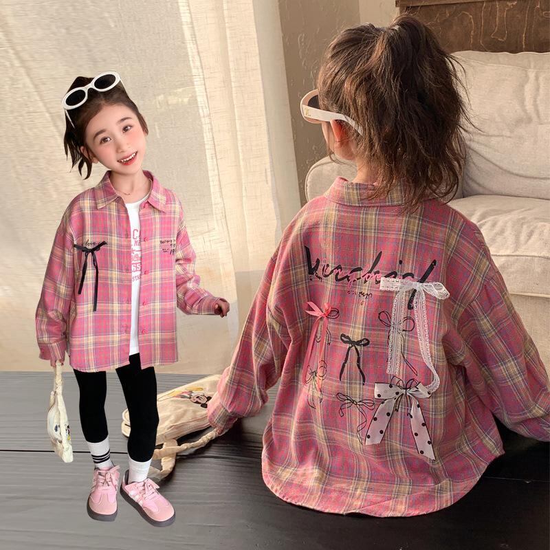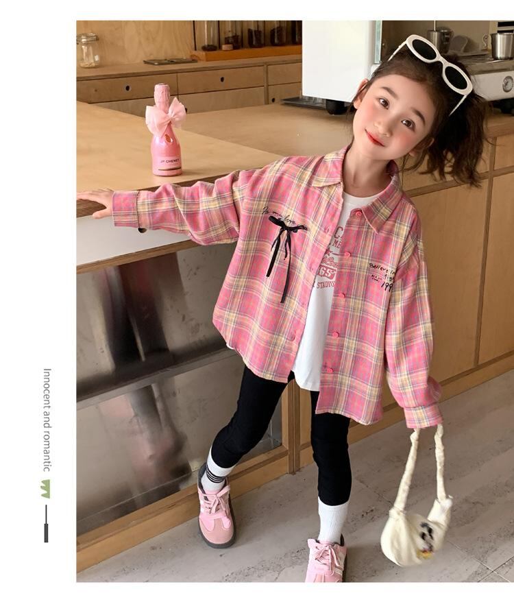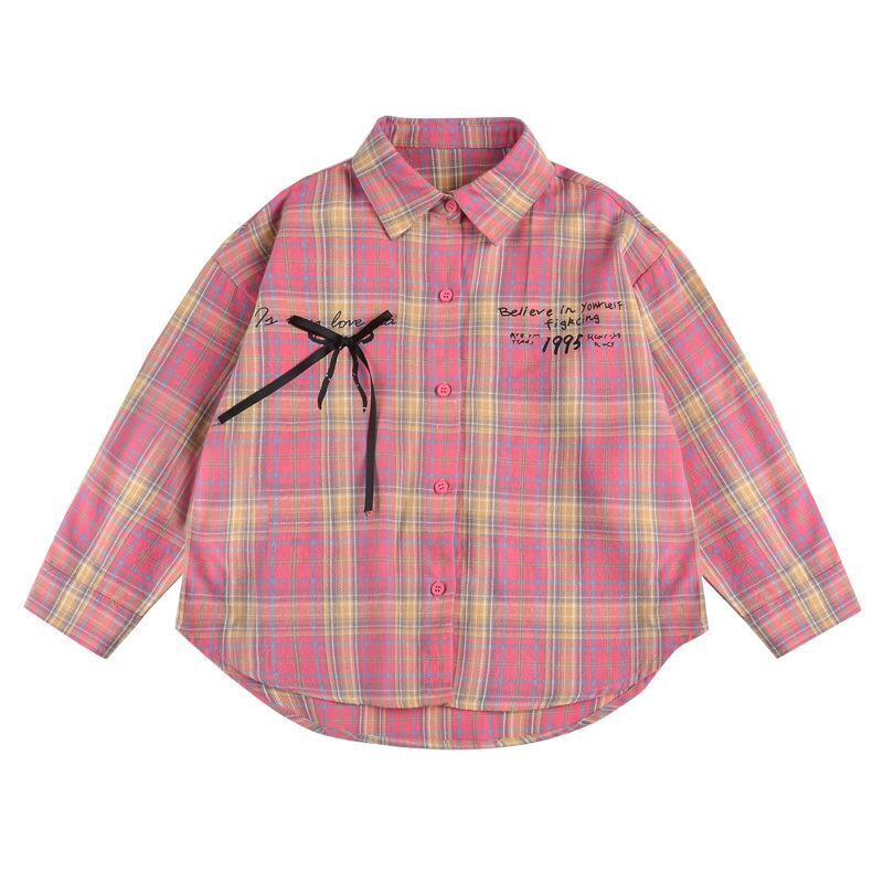 子供服 シャツ 女の子 チェック柄 長袖 トップス 襟付き ブラウス かわいい リボン コットン 春秋 薄手 羽織り 普段使い ピンク系