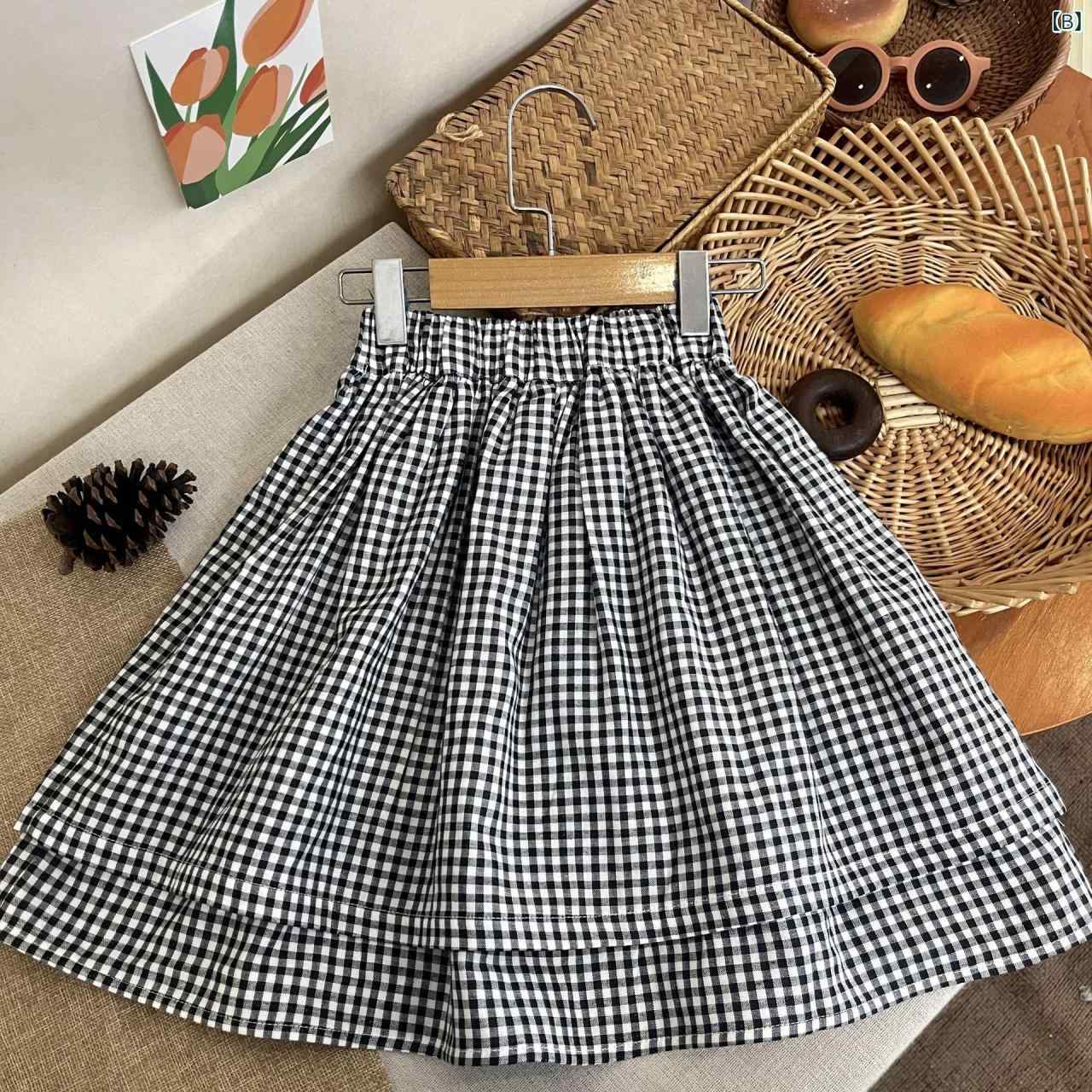 ・カラー: 白シャツ、黒チェック柄スカート、黒ニットカーディガン