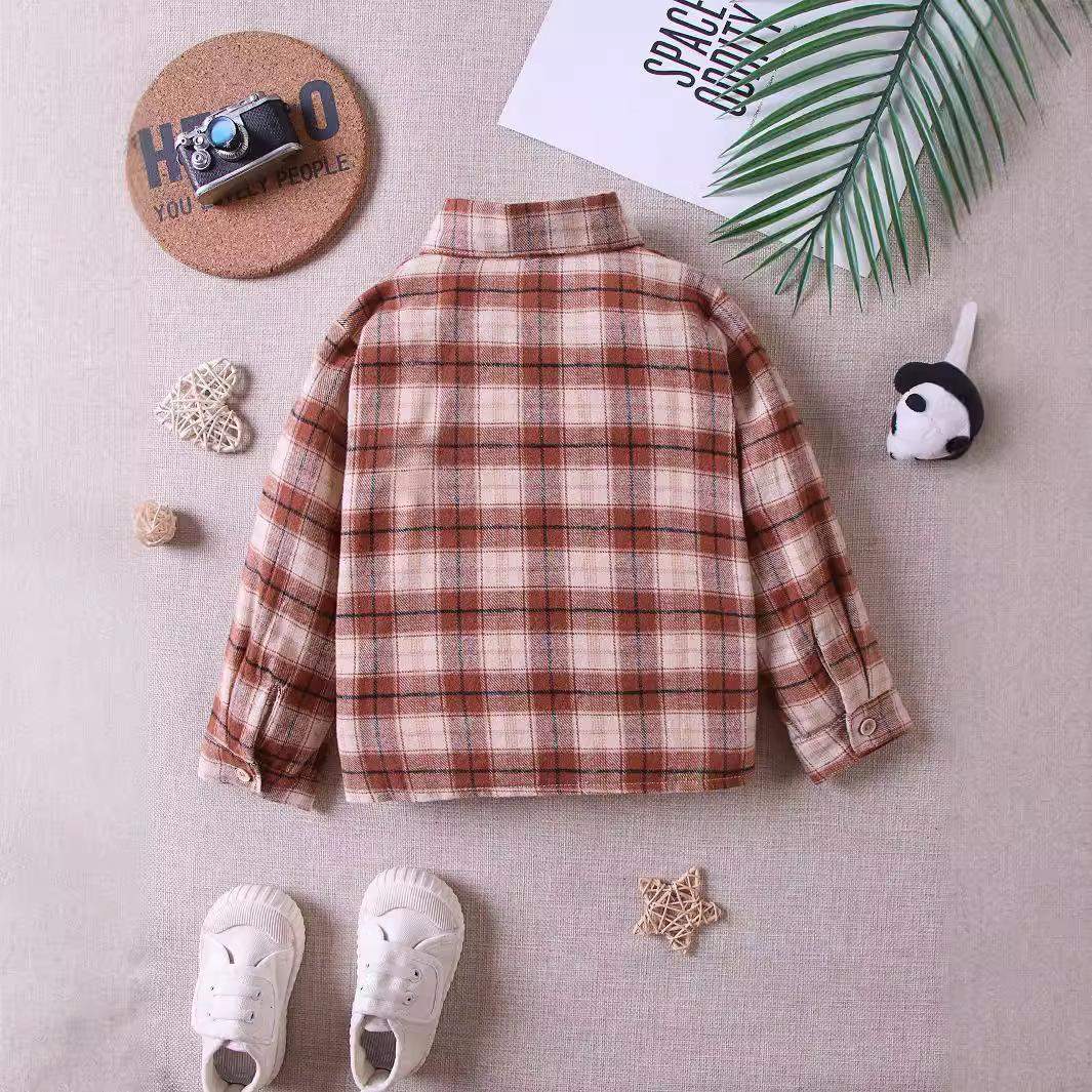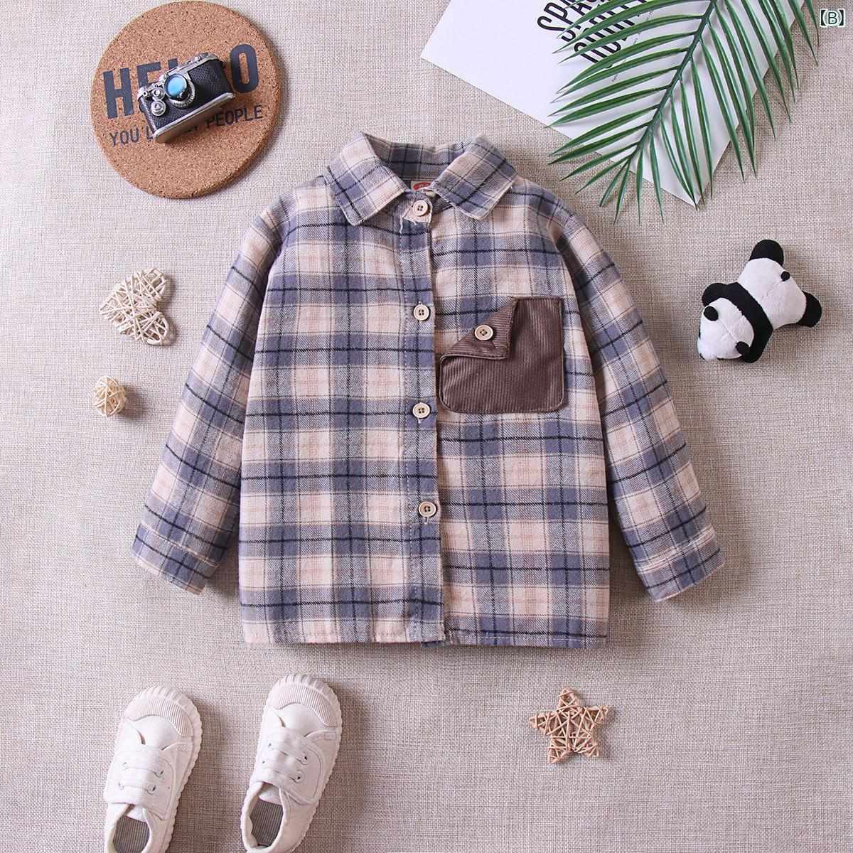 シャツ キッズ 男女兼用 子供服 春秋 格子柄 コットン ポケット付き 襟付き トップス カットソー 男の子 女の子 幼児 幼稚園 保育園 通園 普段着 ブラウン系 ブルー系