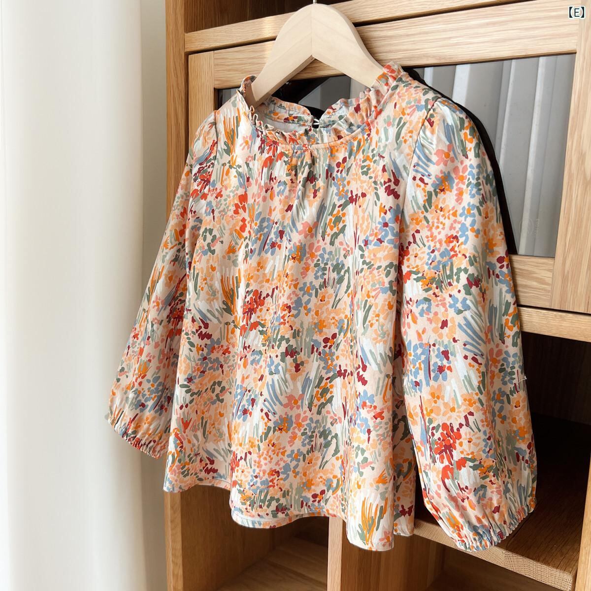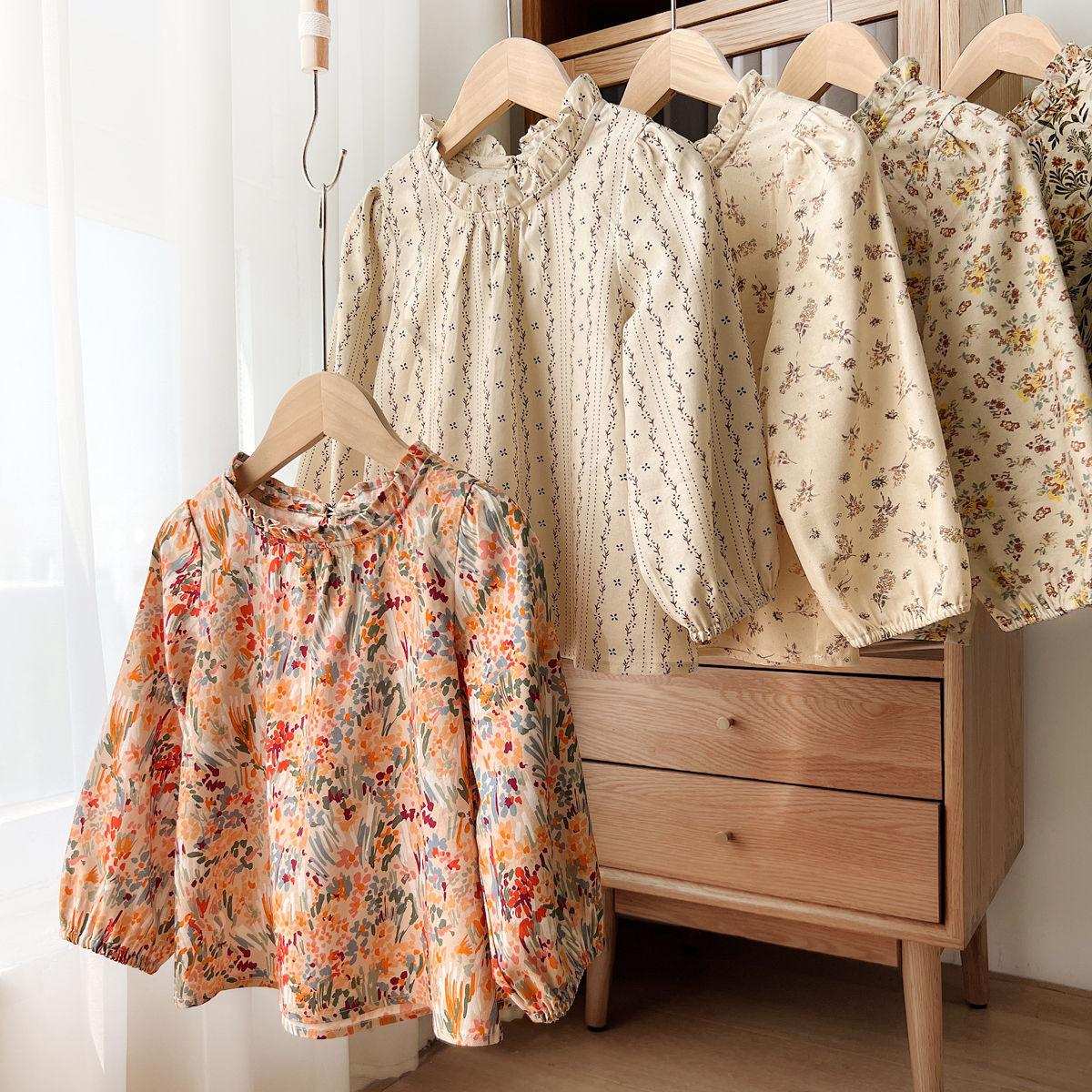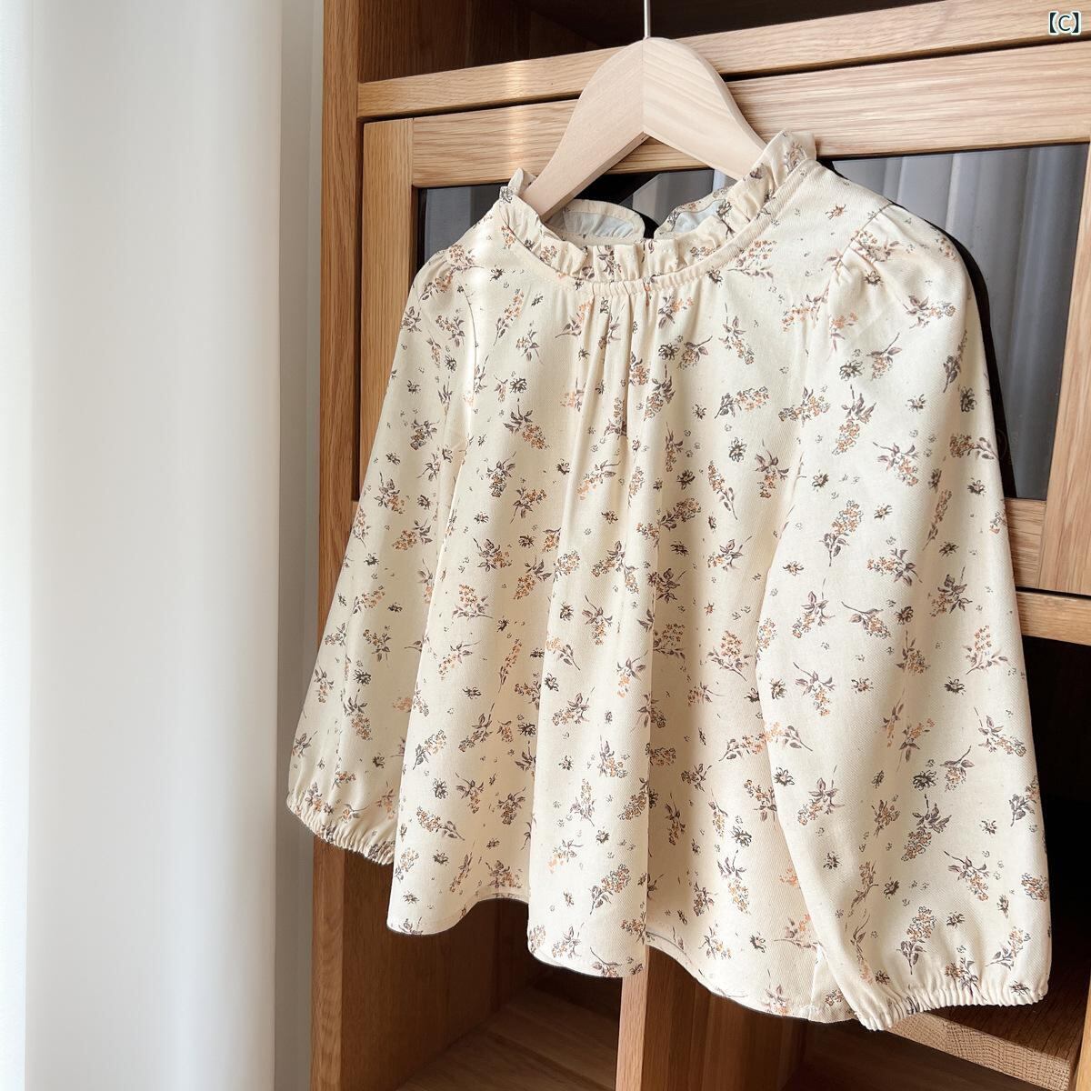 シャツ 女の子 長袖 コットン フラワープリント 子供服 トップス 春秋 中童 大童 ガーリー かわいい 立襟