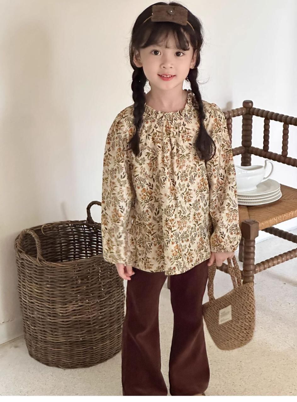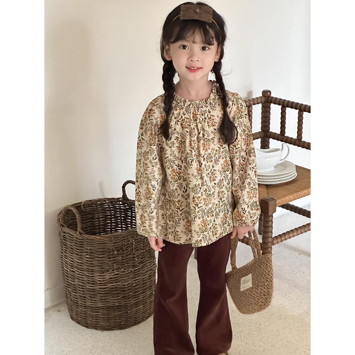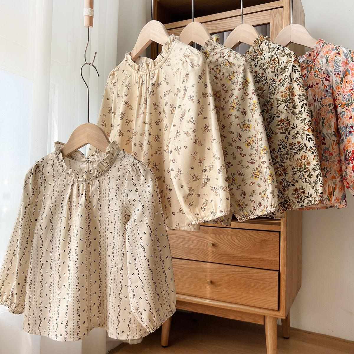 シャツ 女の子 長袖 コットン フラワープリント 子供服 トップス 春秋 中童 大童 ガーリー かわいい 立襟